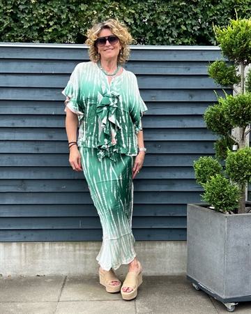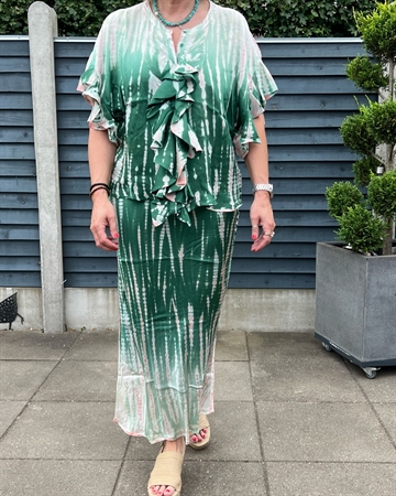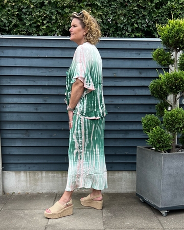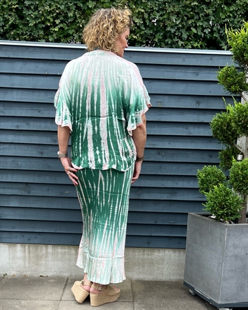 Skøn nederdel fra Asta N. Nederdelen er skåret på skrå, så den falder utrolig smukt på krop. Den er i håndbundet og håndfarvet tie dye, så ikke to nederdele er ens. Nederdelen har en tynd elastik i taljen.