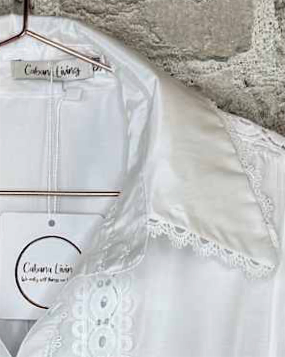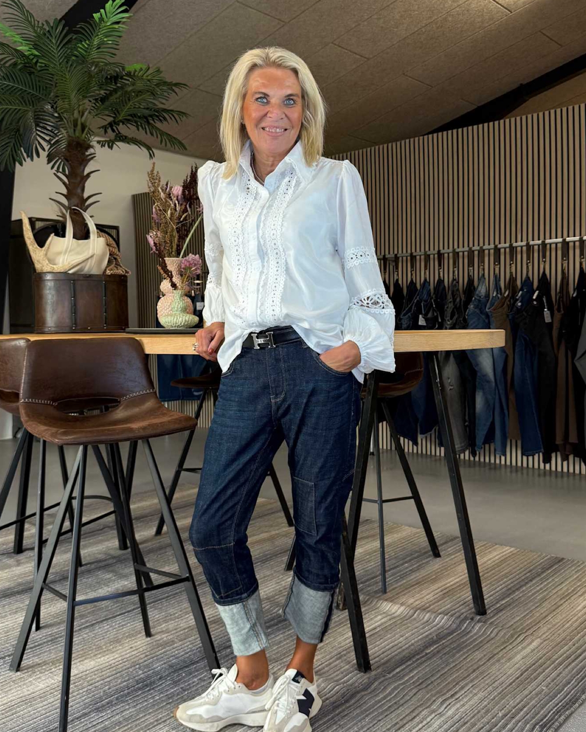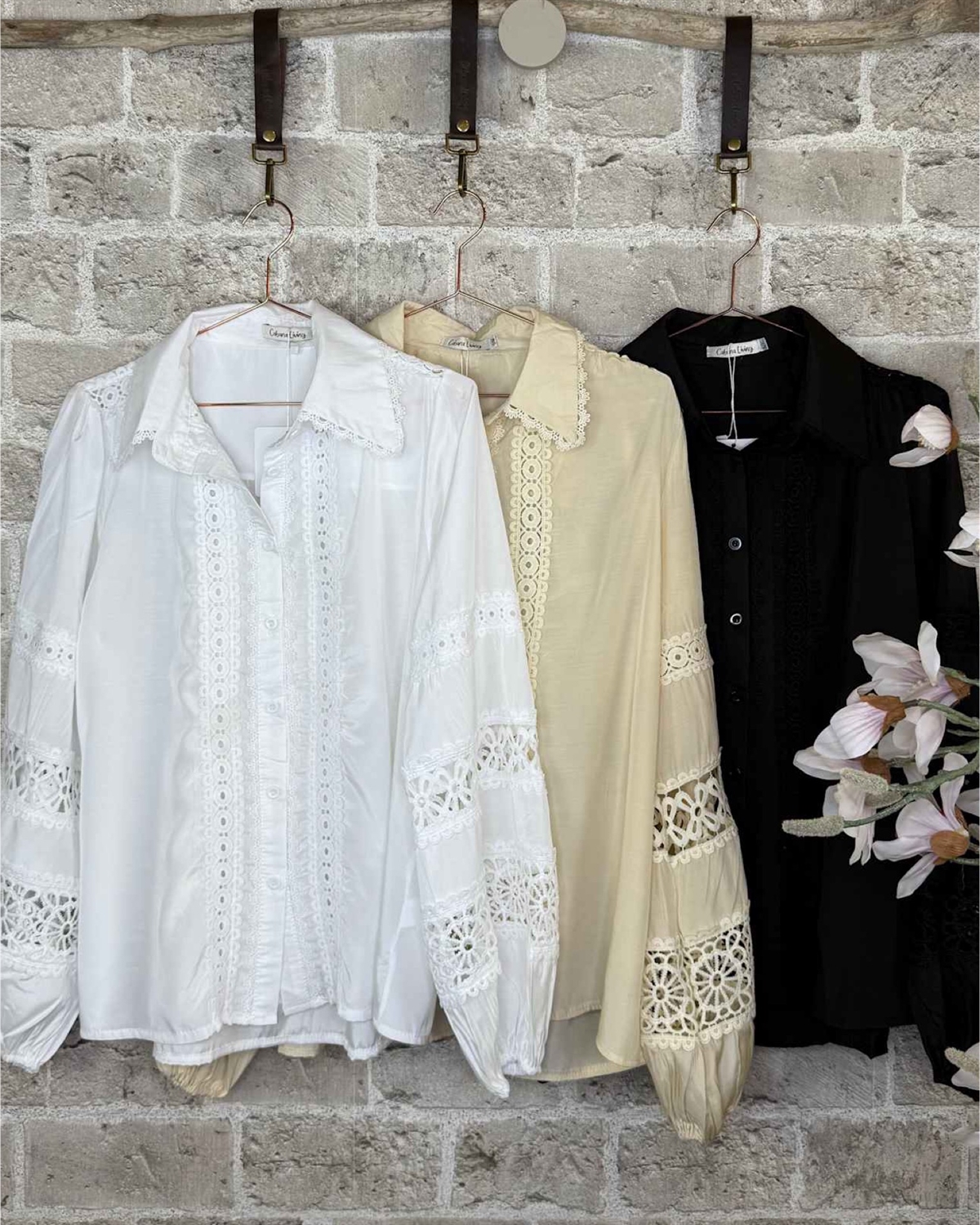 En tidløs og feminin skjortebluse i en smuk hvid farve, der udstråler elegance og lethed. De delikate blonde- og broderidetaljer giver et eksklusivt look, mens de luftige ballonærmer tilføjer en romantisk og boheme-inspireret vibe.