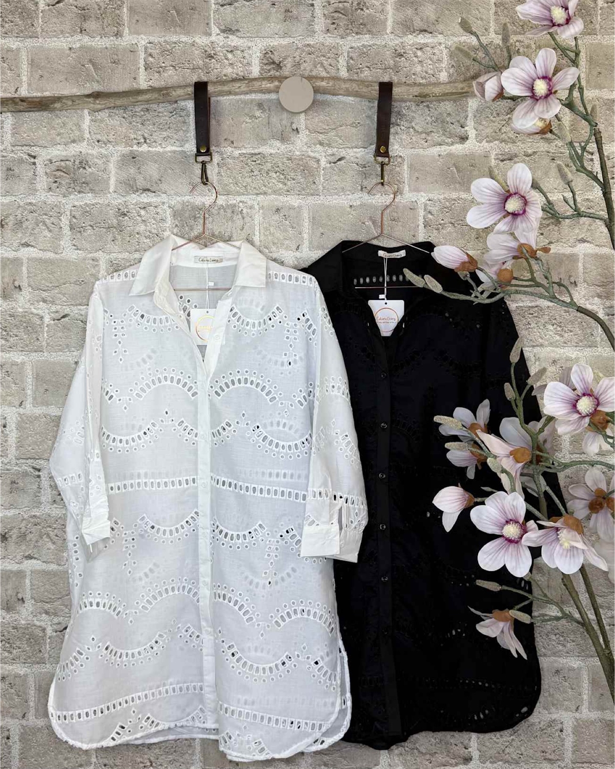 Elegant og romantisk storskjorte fra Cabana Living i smukt broderi anglaise. Denne hvide skjorte har et eksklusivt og feminint look med fine broderede detaljer, som giver et let og luftigt udtryk.