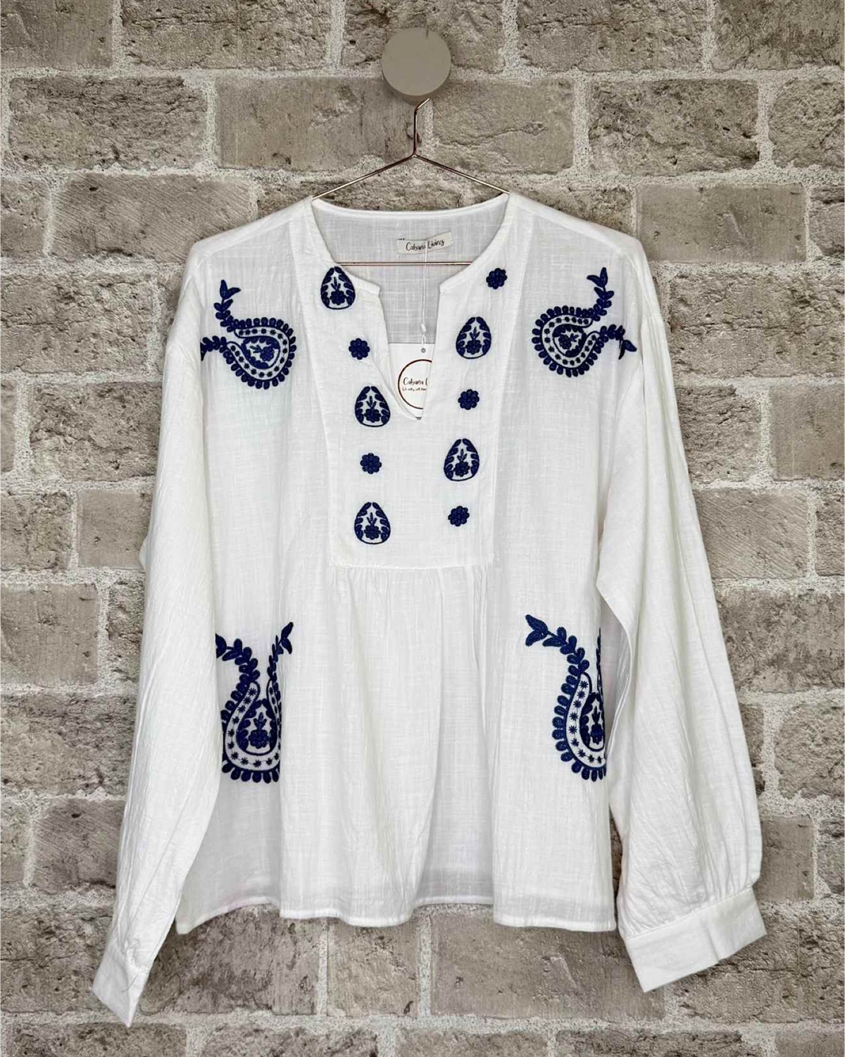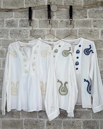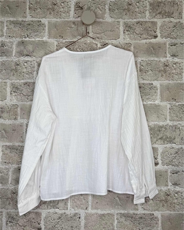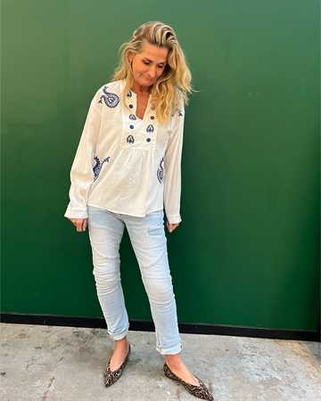 Smuk og feminin skjorte fra Cabana Living i en let og luftig bomuldskvalitet. Skjorten har et elegant boho-inspireret design med fine blå broderier, der skaber et eksklusivt og unikt udtryk.