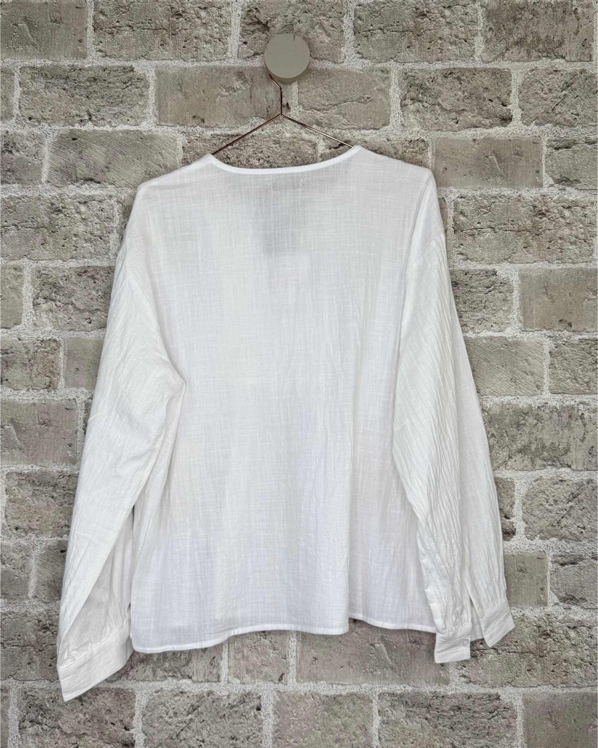 Den har en flatterende V-udskæring med smukke broderede detaljer, lange ærmer med manchet og en løs pasform, der giver en behagelig og afslappet stil.