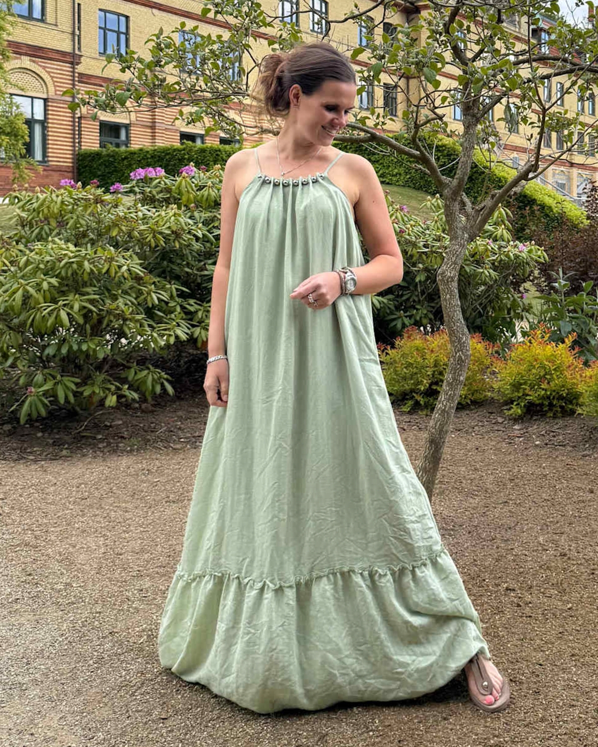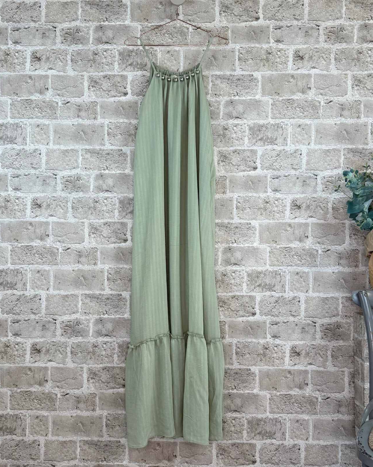 Sæt farve på sommeren med denne uimodståelige stropkjole fra Cabana Living i en rolig og eksklusiv grøn nuance. Kjolen har et løstsiddende og luftigt snit med fine detaljer, der oser af sommer og lethed. Det smukke fald, den feminine flæsekant og de elegante sølvperler langs udskæringen giver et sofistikeret boho-twist, der gør den perfekt til både ferie og hverdag.