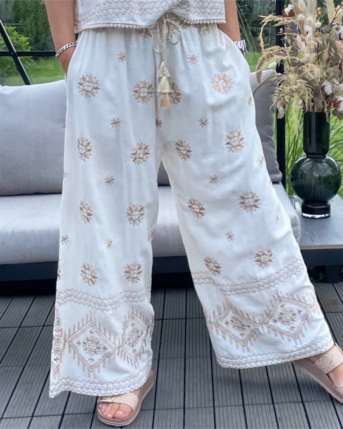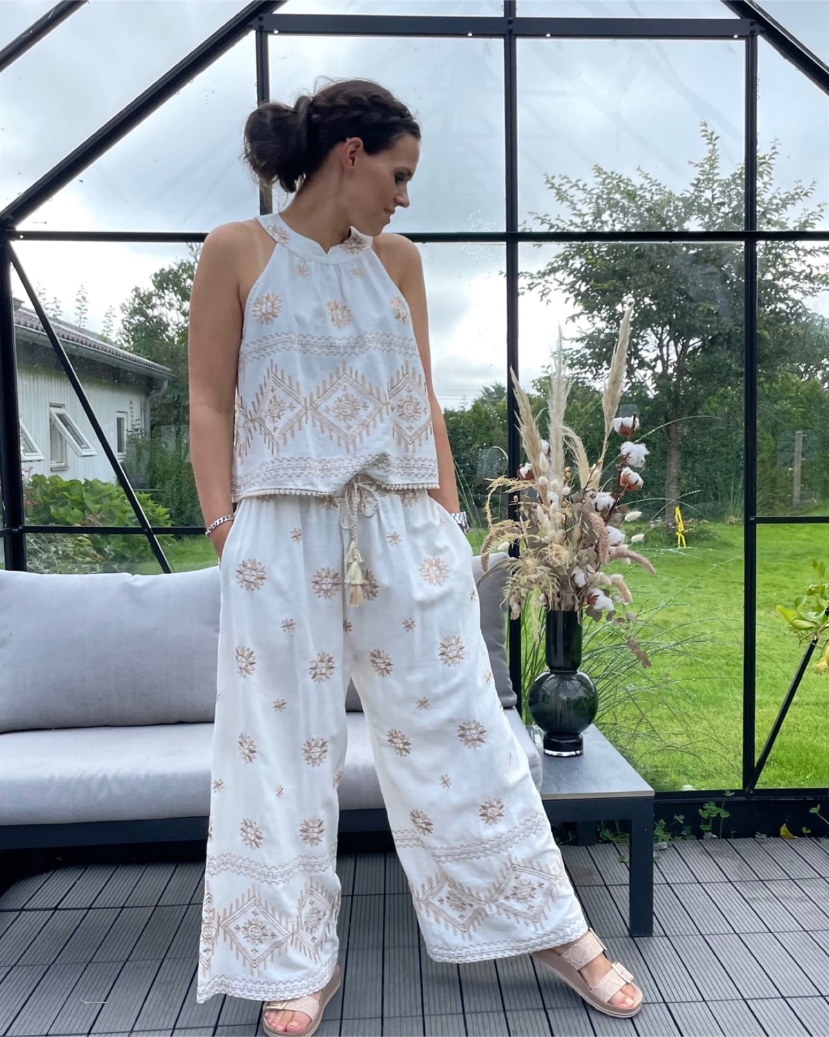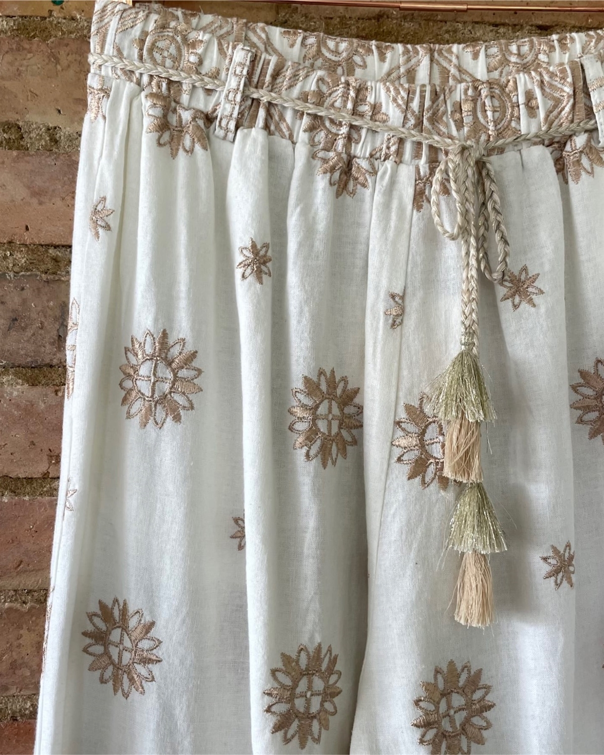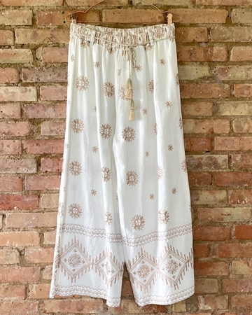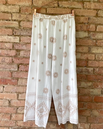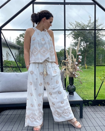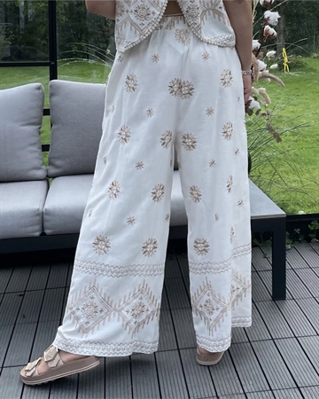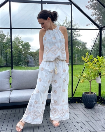 Meget smuk klassisk buks med store brodderier fra Cabana Living, buksen er med elastik linning og har bælte stropper. Der medfølger et flettet smalt bælte med guld lurex tråd.Buksen er med vidde i benene.