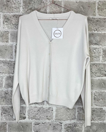 Lækker og blød strikcardigan fra Cabana Living. Cardiganen har en feminin V-udskæring og fine knapper langs fronten, der giver et klassisk og tidløst look. Den lette og behagelige kvalitet gør den perfekt som et ekstra lag til både hverdag og mere afslappede anledninger. Med sin afslappede pasform og stilrene design er denne cardigan et must-have i enhver garderobe – perfekt til at style over en skjorte, kjole eller en enkel top.
