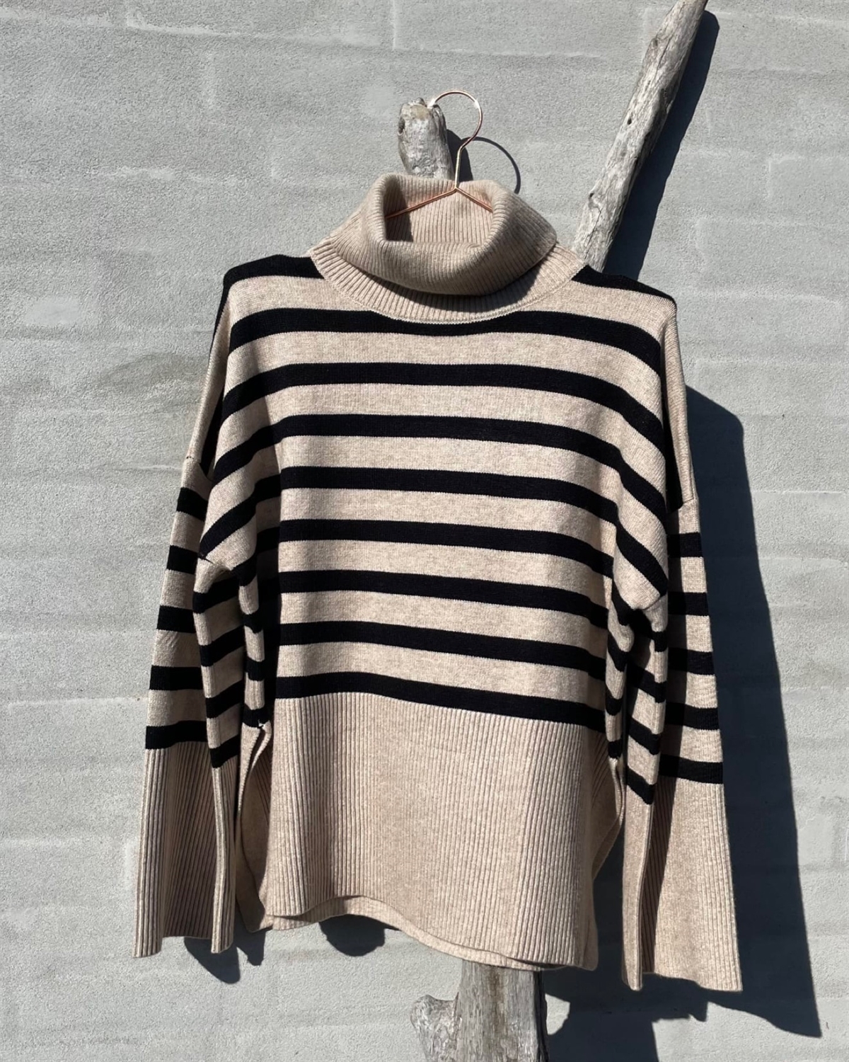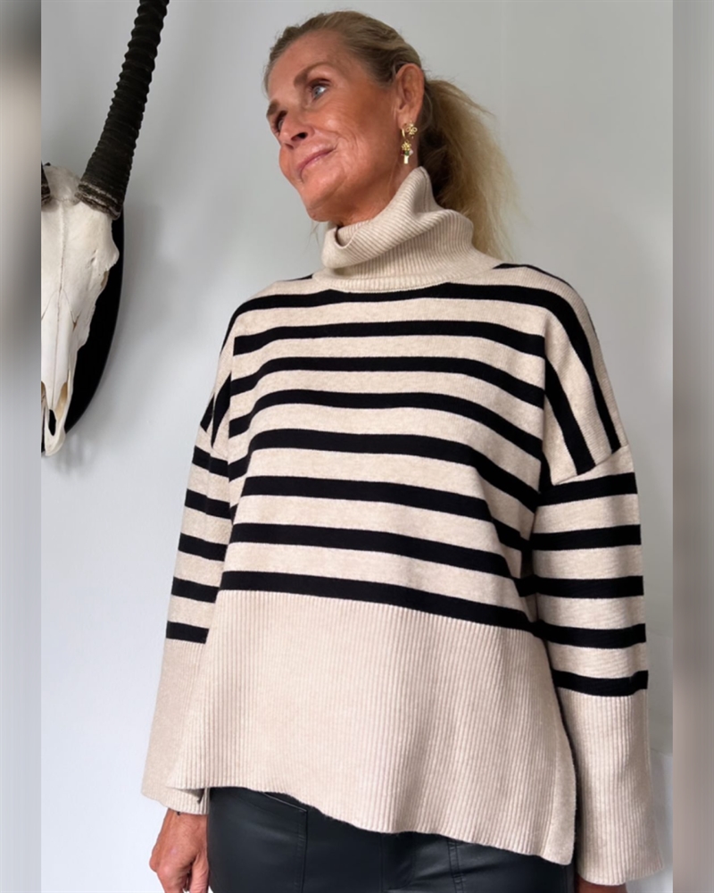 Cool rullekravestrik fra Cabana Living. Rullekraveblusen er med rullekrave og stribe. Høj rullekrave samt rib for neden og på ærmer.