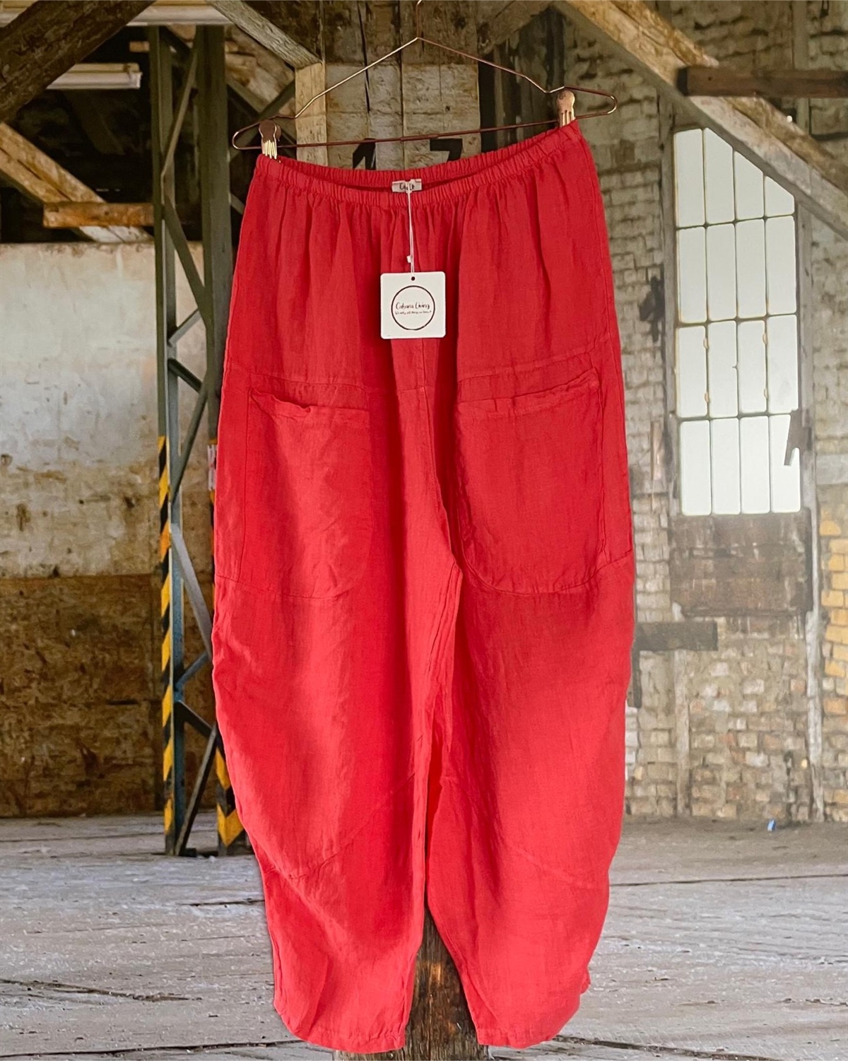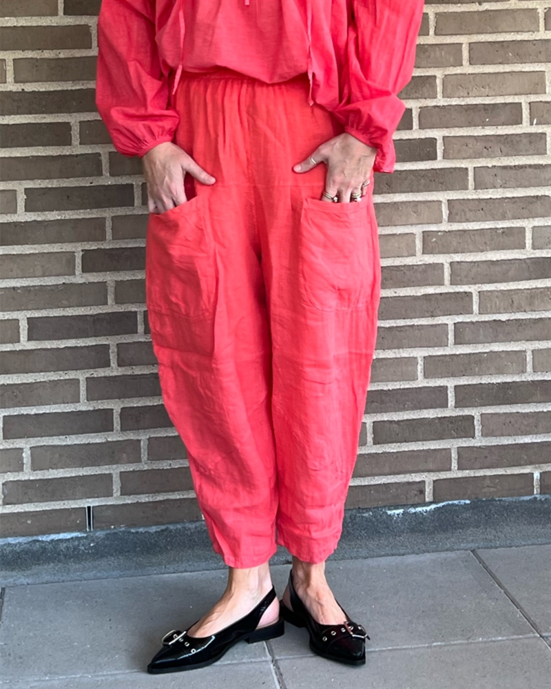 Super cool baggy hør buks fra Cabana Living. Bukserne har elastik i taljen, så den kan både sættes i taljen eller lidt nede på hoften. Foran har den 2 lavt siddende påsyet forlommer. Buksebenene er brede, men smaller lidt ind forneden. Bussen er lidt gennemsigtig. Men helt klart årets MUST HAVE