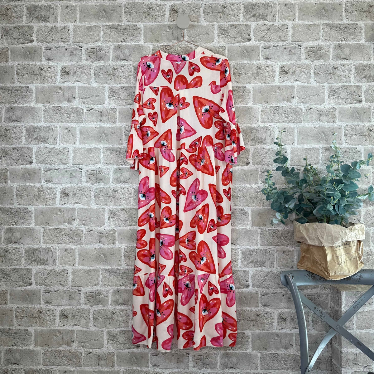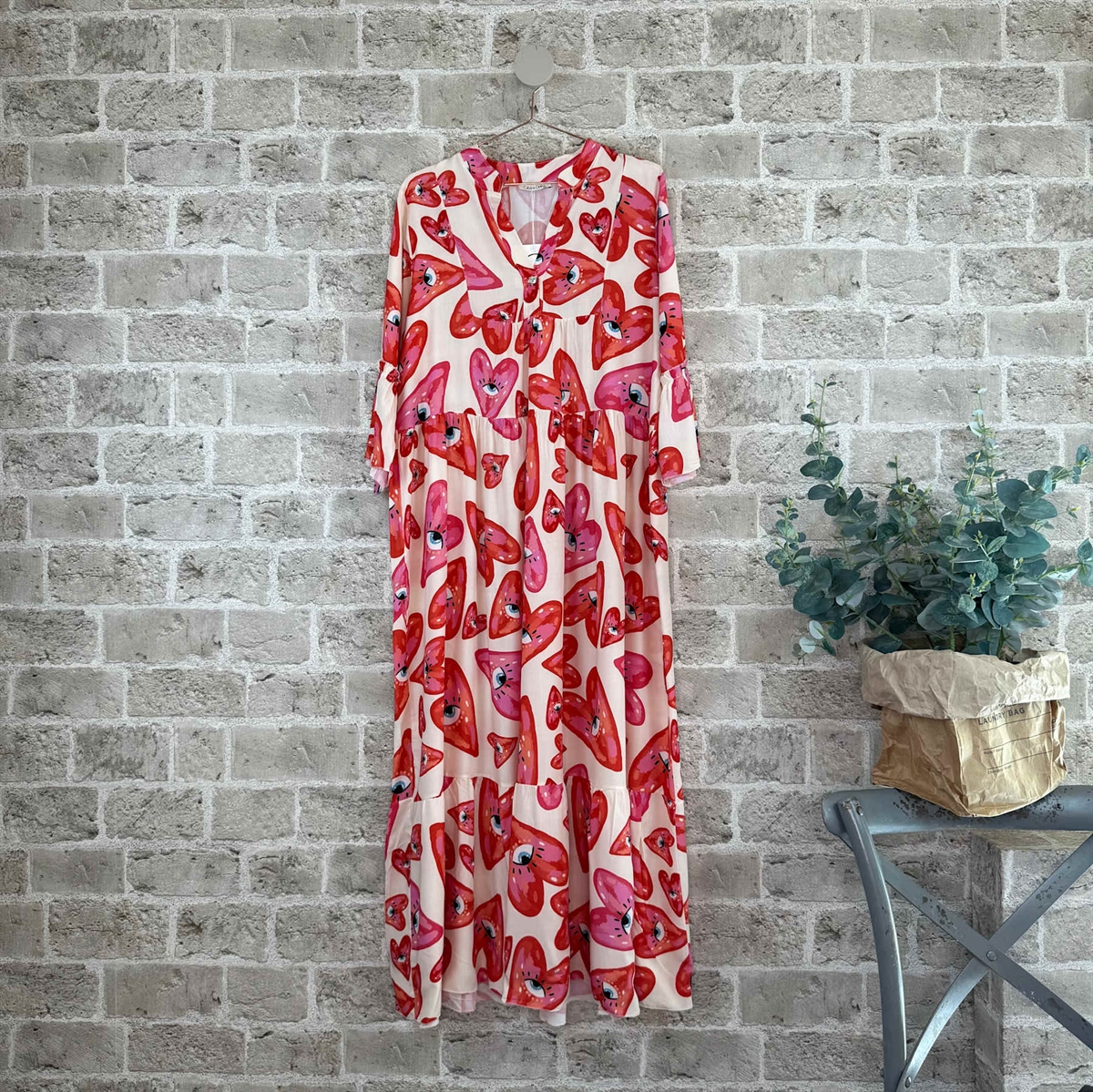 Cabana Living Eli 8822 kjole! Den unikke print med kunstneriske hjerte- og øjenmotiver i røde og pink toner gør denne kjole til et statement piece i enhver garderobe. Pasformen er løs og luftig med trekvartlange ærmer, feminine læg og rund halsudskæring, der giver et flatterende og afslappet udtryk. Perfekt til både sommerens fester, cafébesøg og ferier – eller når du vil skille dig ud med stil og komfort.