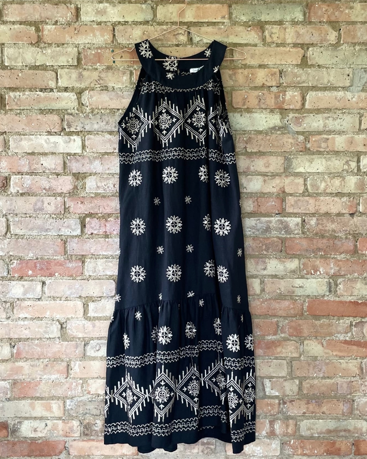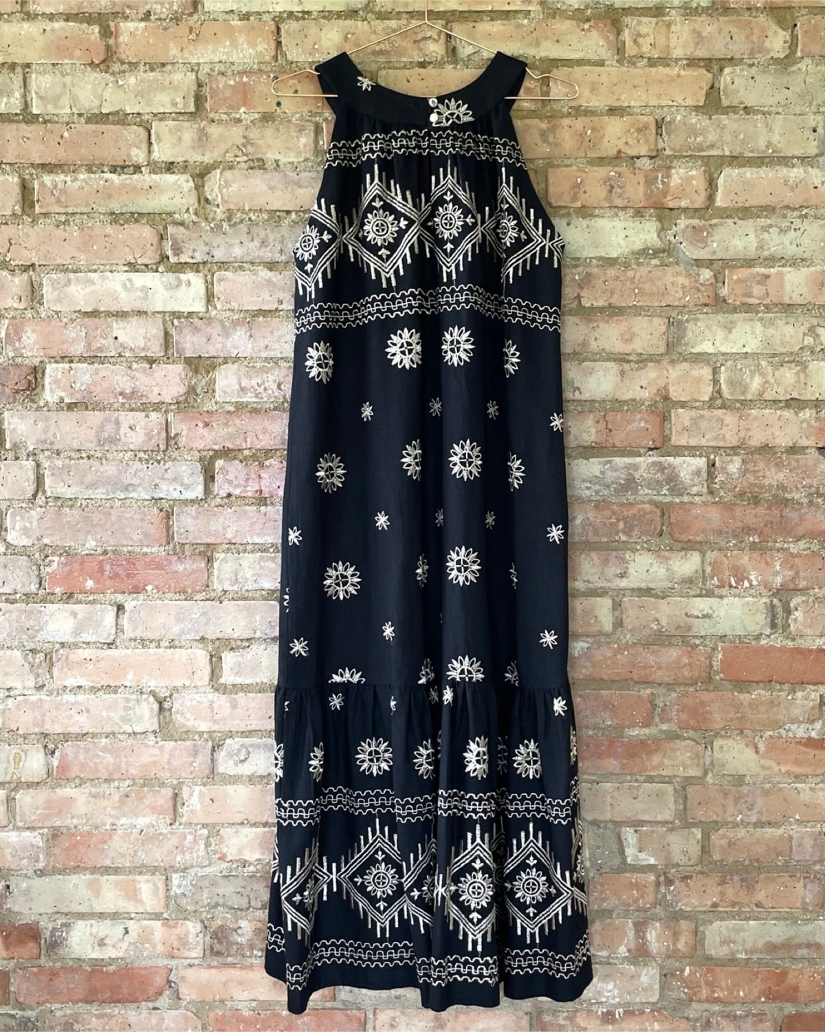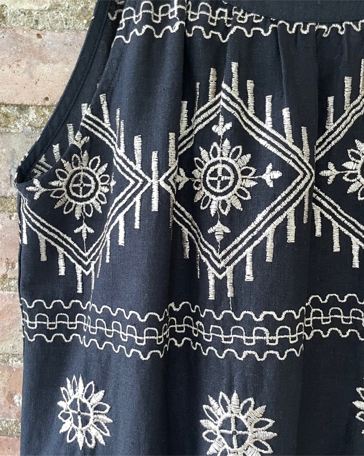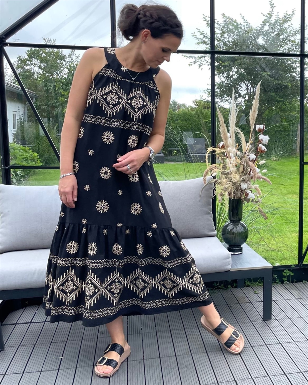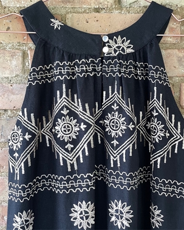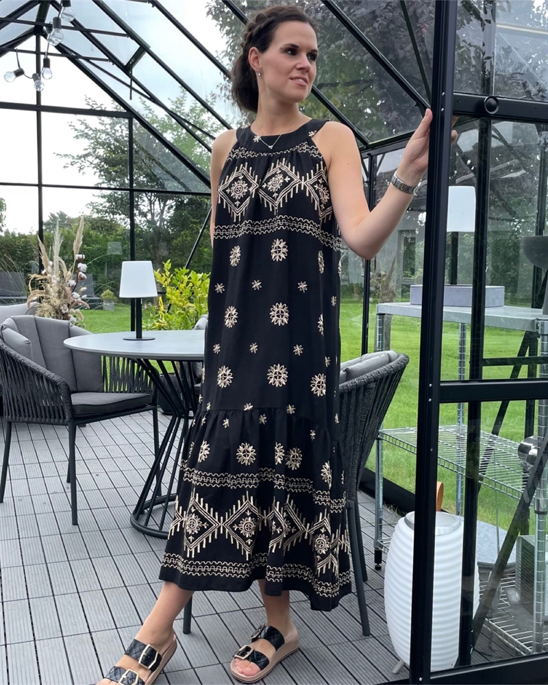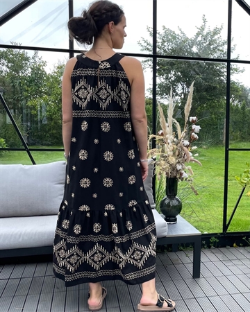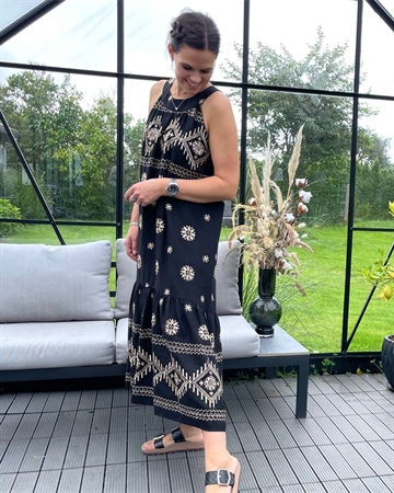 En lang smuk kjole med broderie fra Cabana Living, Kjolen er med et bred rund skæring og lukkes med 2 knapper i nakken. Kjolen bæres på skulderene og falder derfor let og elegant.