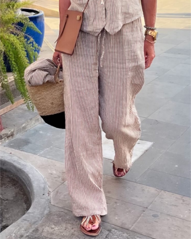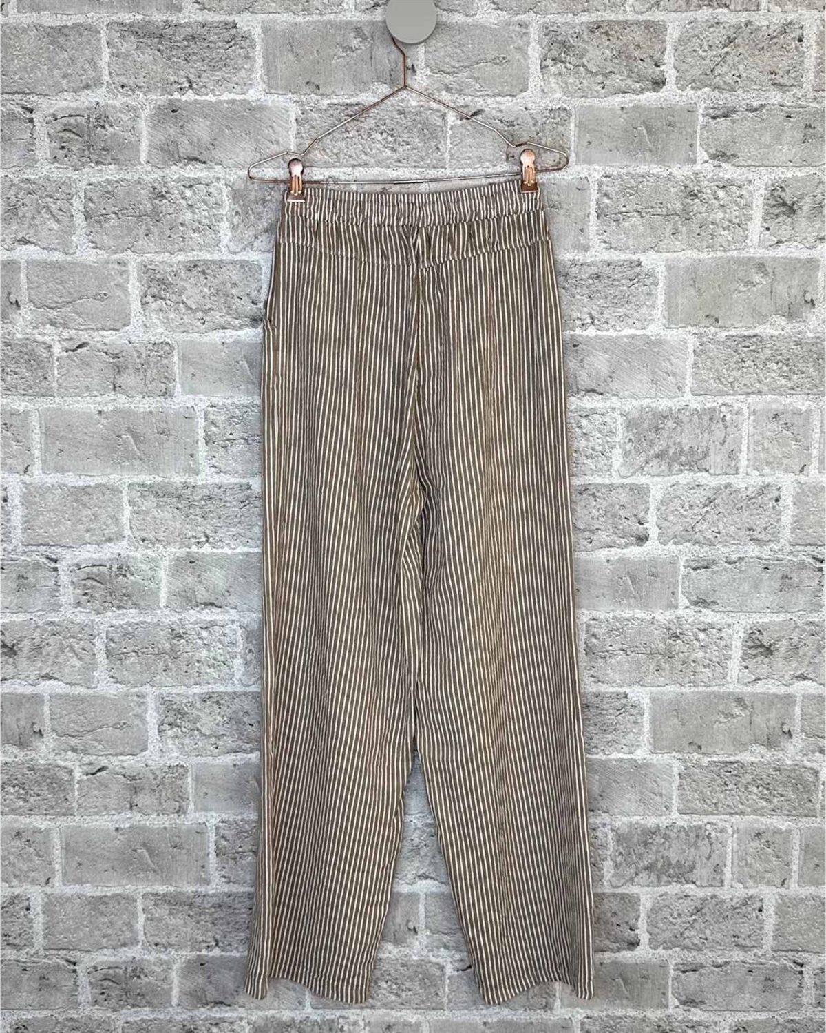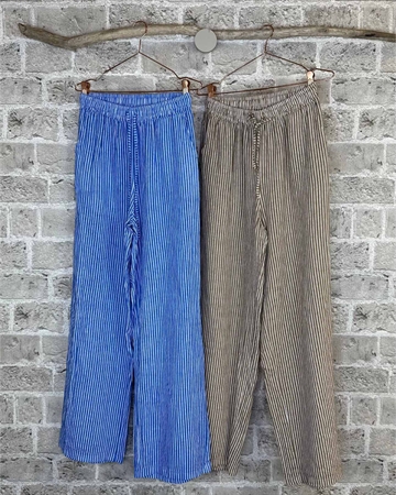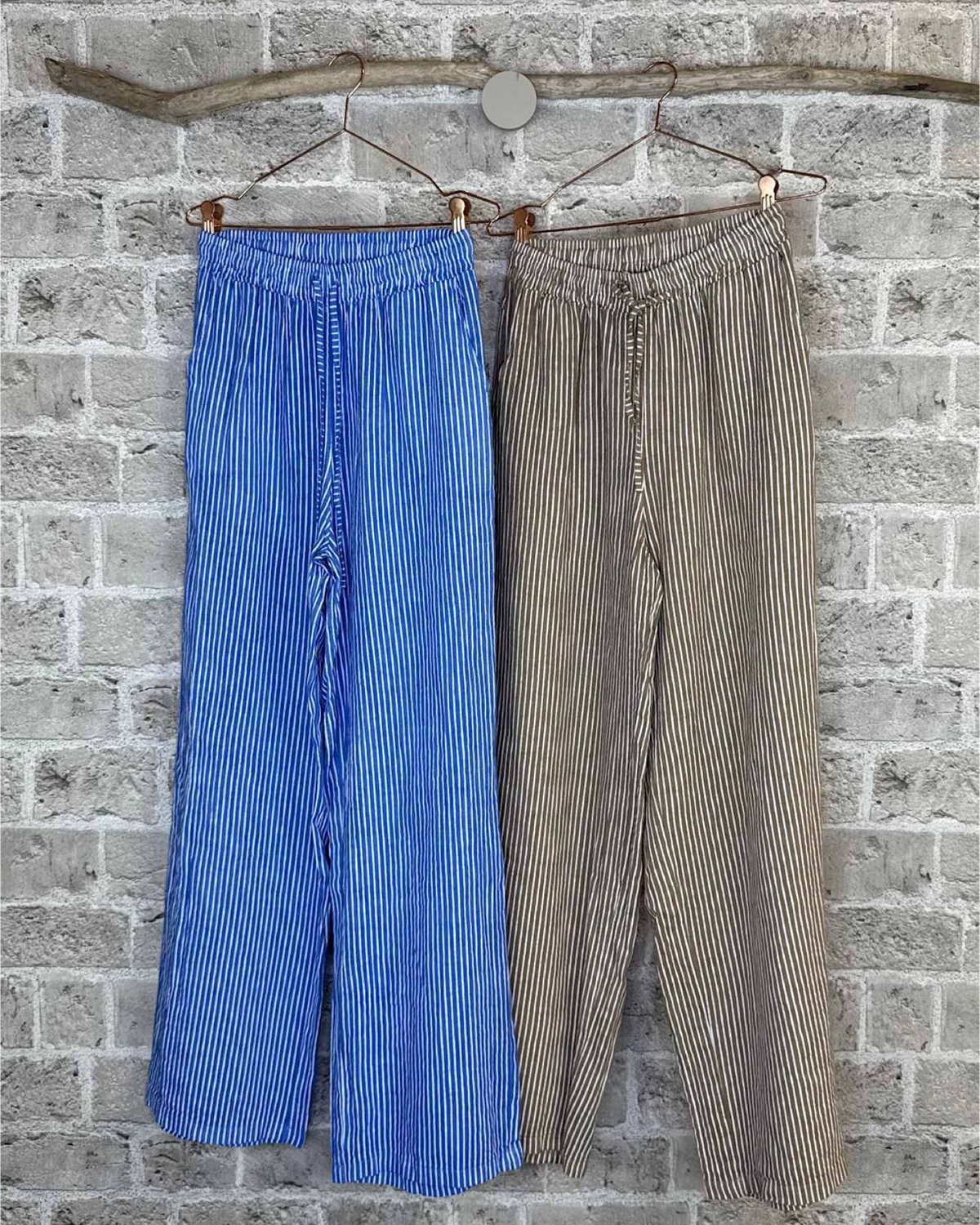 Smarte og stilfulde stribede hørbukser fra Cabana Living. Bukserne er lavet i let og åndbart hørmateriale, der sikrer maksimal komfort og et moderne look. Det tidløse blåstribede design gør dem nemme at style til både hverdag og afslappede anledninger. Perfekte til sommergarderoben eller når du ønsker et afslappet, men sofistikeret udtryk. Et must-have for den modebevidste kvinde!