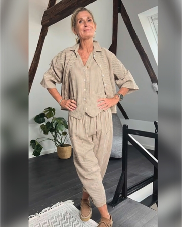Skøn og sommerlig stribet hørbluse fra Cabana Living. Blusen er kort i længden og lavet i let og behageligt hørmateriale, der giver et afslappet og elegant look. Den er gennemknappet og har vidde i ærmerne, som tilføjer et feminint og luftigt touch. Perfekt til både hverdag og feriestemning – et must-have til din garderobe!