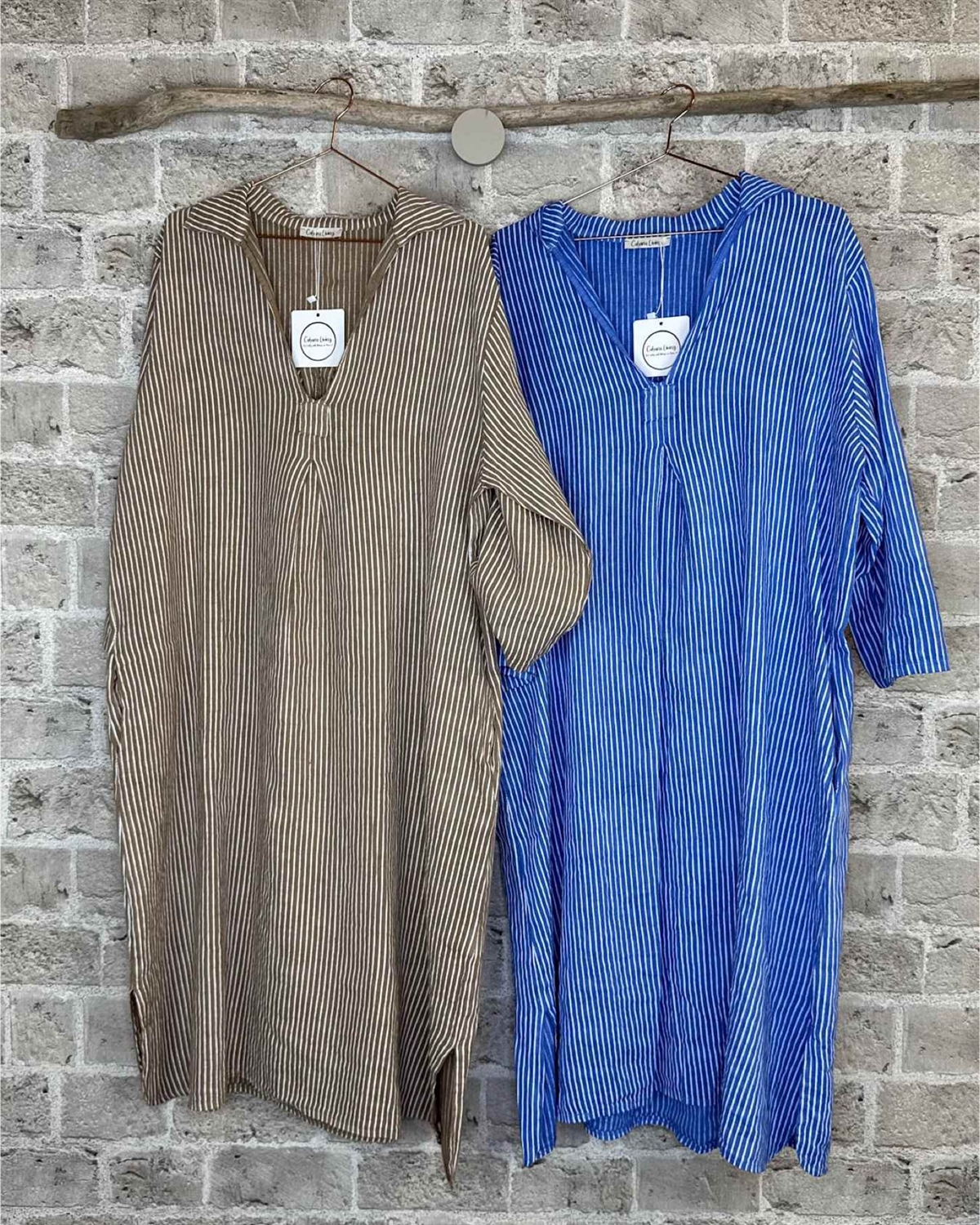Denne smukke hørkjole fra Cabana Living kombinerer klassisk elegance med afslappet komfort. Med sin løse pasform og lette hørkvalitet er den perfekt til både hverdagsbrug og sommerlige udflugter. De diskrete striber tilføjer et sofistikeret touch, mens den flatterende V-udskæring og opsmøgede ærmer skaber et afslappet look. Brug den med sandaler for et casual udtryk eller style den op med accessories for et mere raffineret look. En tidløs favorit, der passer til enhver garderobe.