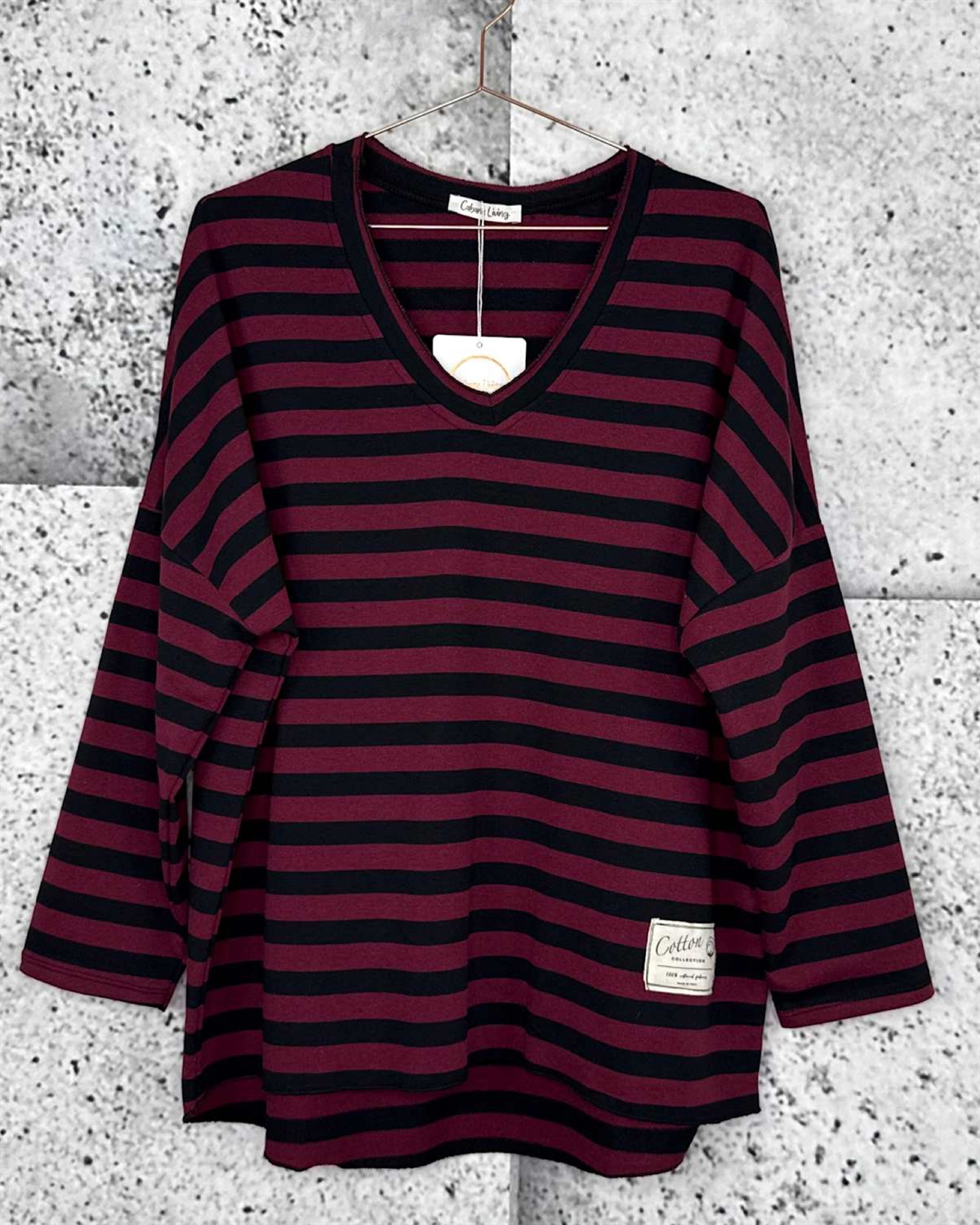 Langærmet stribet T-Shirt fra Cabana Living med rå kanter i hals og bunden. Blusen er bredere i toppen end i bunden.
