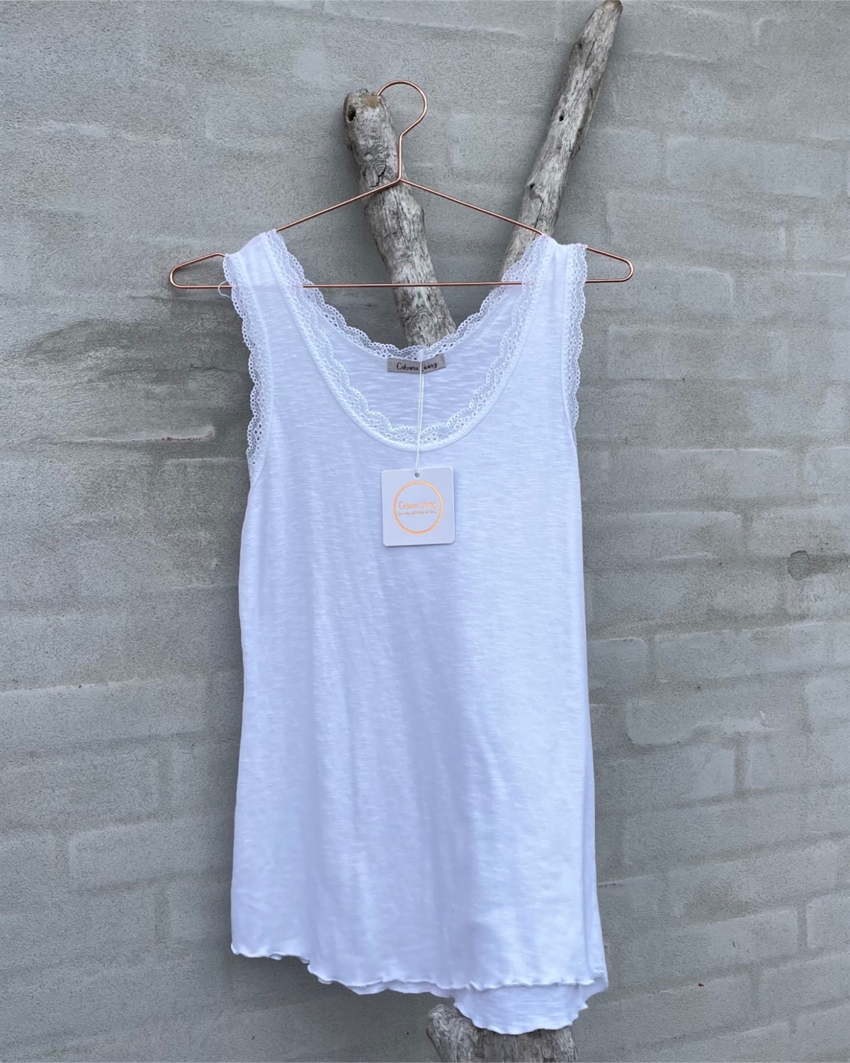Feminin rib top fra Cabana Living med blonde kant rundt i halsudskæringen samt rundt i ærmegab.