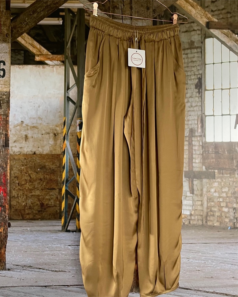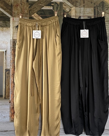 Elegant shiny buks fra Cabana Living med skrålommer bred elastik linning, hvori der er sat et bredt bånd. Buksen er designet med vidde i benene som samles med læg nede i bunden samt afsluttet med et flot kantbånd.Bagtil er den helt enkelt, og rundt i linningen har den let rynke effekt. Virkelig en flot buks, som helt sikkert kan styles på mange måder