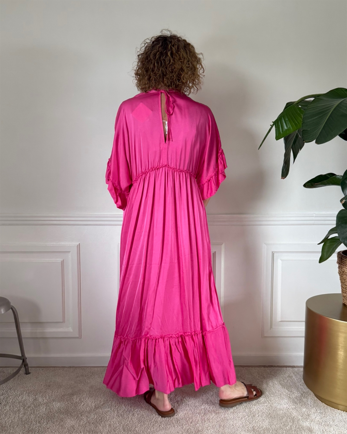 Sæt kulør på sommeren med denne fantastiske kjole fra Cabana Living! Samba-kjolen er designet til at give dig et ubesværet og feminint look med sin løse pasform, flæsedetaljer og elegante v-udskæring – både foran og bagpå. Bindebåndet i nakken og under barmen giver kjolen et sofistikeret touch, samtidig med at den falder smukt om kroppen.
