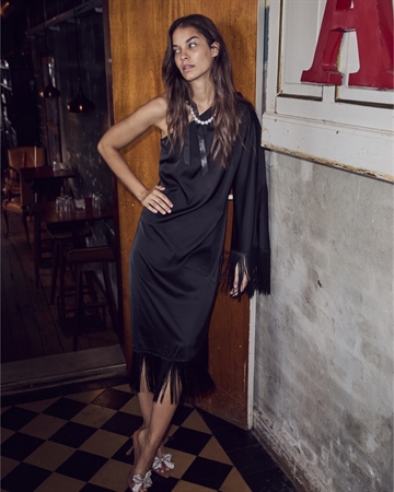 Elegant og stilfuld asymmetrisk kjole fra Co'Couture i en luksuriøs satin-kvalitet med smukke frynsedetaljer. AdnaCC Fringe kjolen har en løstsiddende pasform, der giver et sofistikeret og komfortabelt look. Kjolen har en længde, der går til under knæet, og den lukkes diskret med en skjult lynlås i siden. Perfekt til festlige lejligheder, hvor du ønsker et moderne og eksklusivt udtryk. Et must-have i din garderobe!