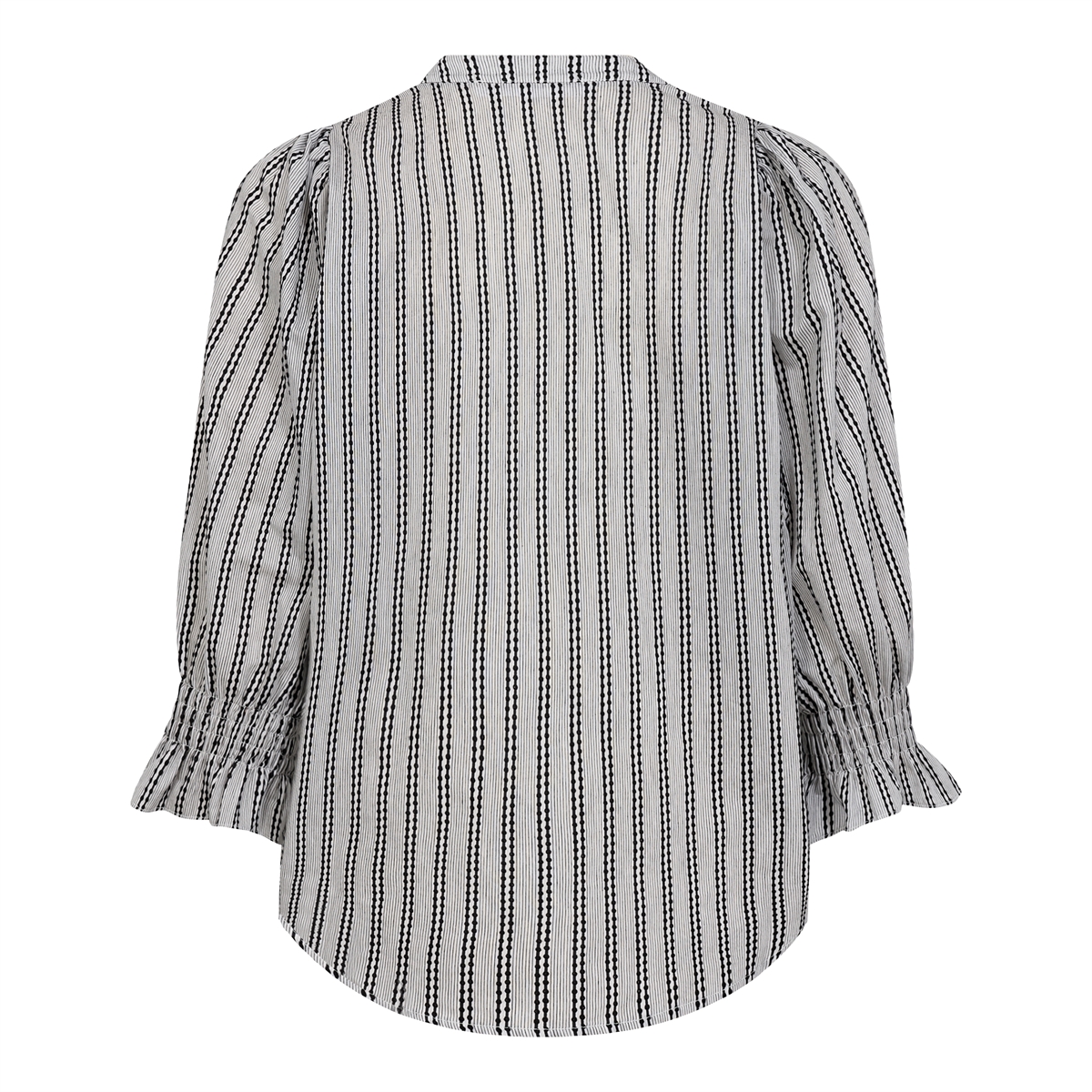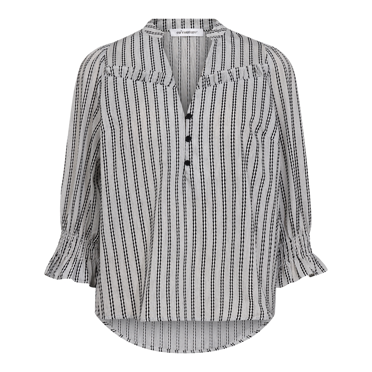 Smuk og feminin bluse fra Co’ Couture i et stilrent hvid-sort stribet design. Blusen har en elegant V-hals med fine knapper foran, der giver et sofistikeret touch. De lange ærmer har let volumen og afsluttes med fine flæsedetaljer ved manchetterne samt elastik, som tilfører et feminint og moderne udtryk. Blusen har en normal pasform med en afrundet kant forneden, der gør den både behagelig og let at style. Perfekt til både hverdag og festlige lejligheder – kombiner den med jeans eller en nederdel for et stilfuldt look!
