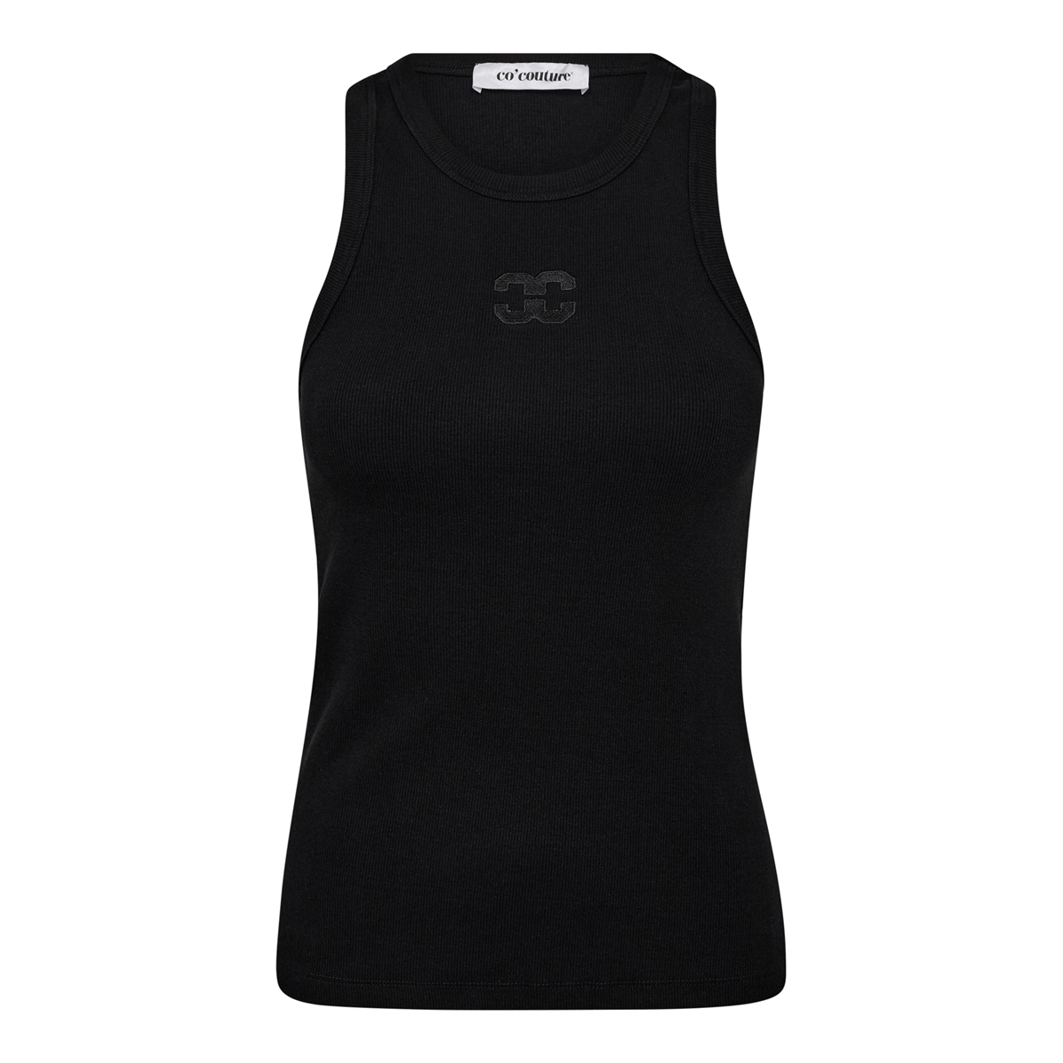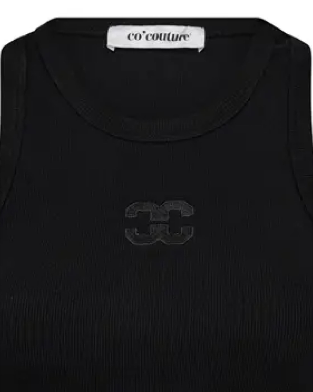 Klassisk og stilfuld tanktop fra Co' Couture i en smuk ribbet kvalitet. Denne top har en tætsiddende pasform og en elegant rund halsudskæring, der fremhæver figuren på en flatterende måde. Den er dekoreret med et diskret broderet Co' Couture-logo på brystet, som giver et eksklusivt touch.