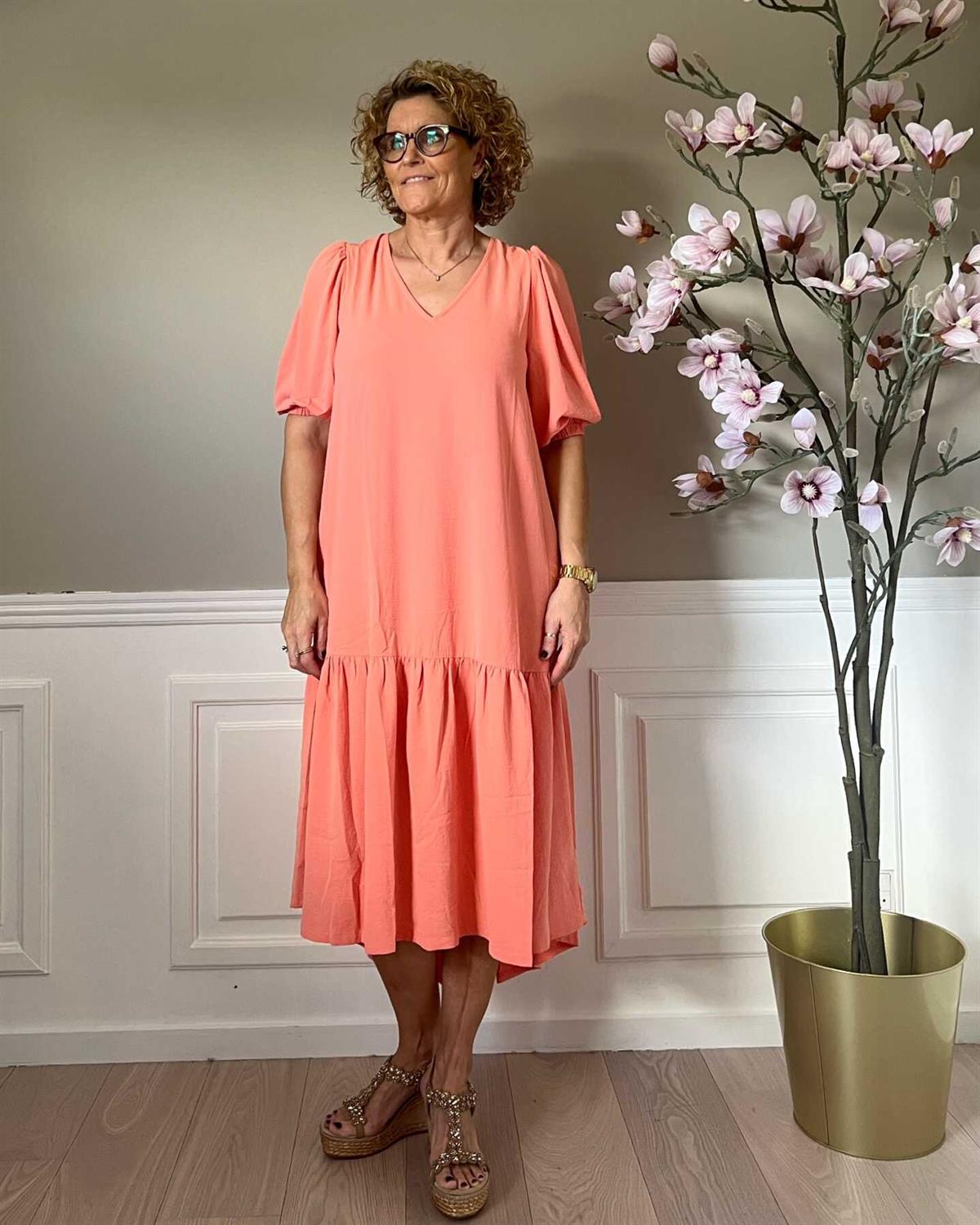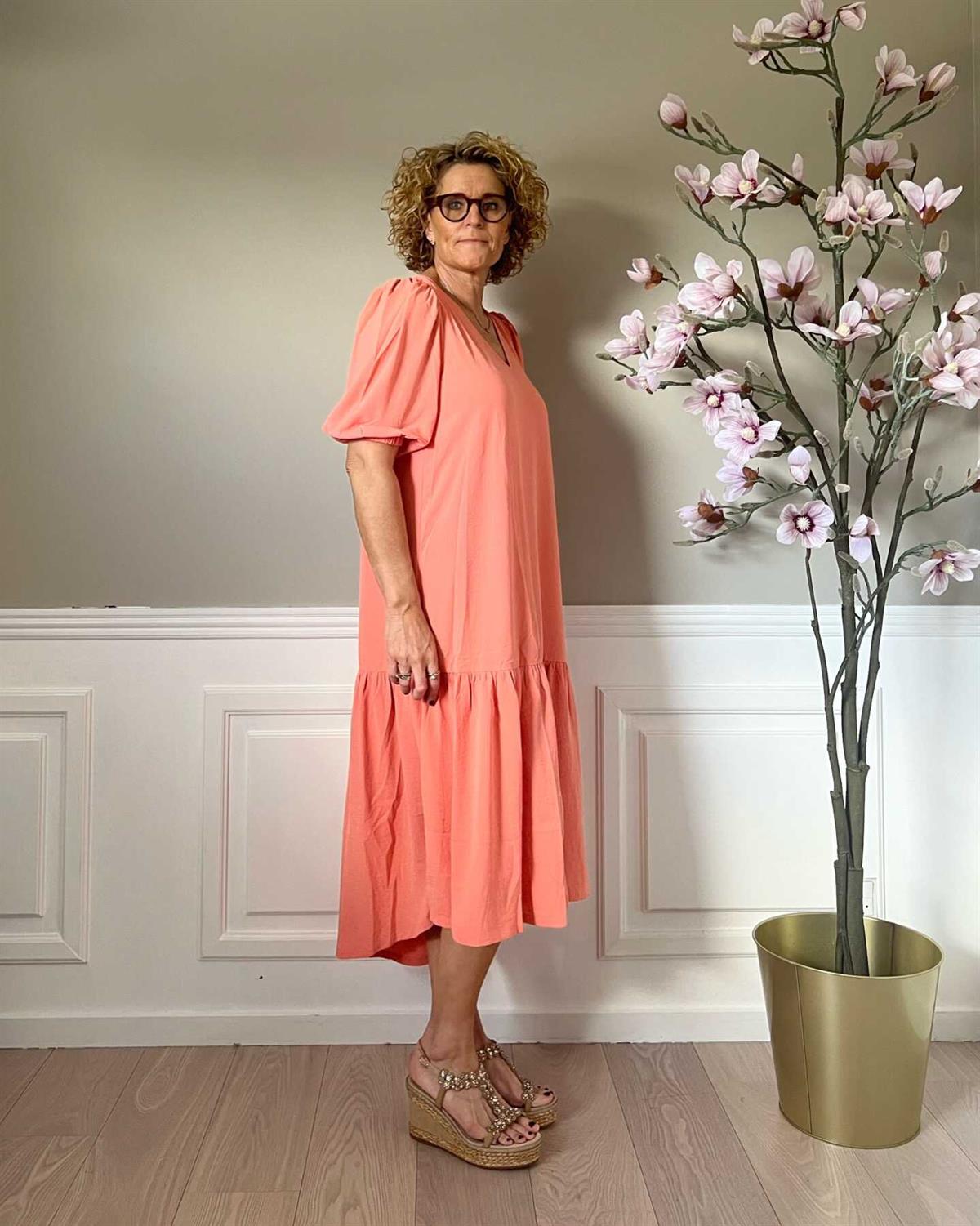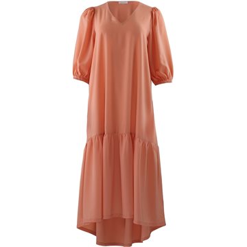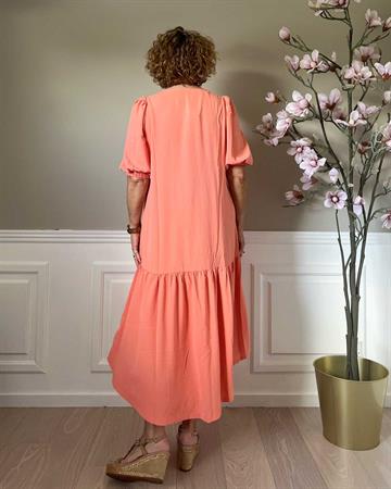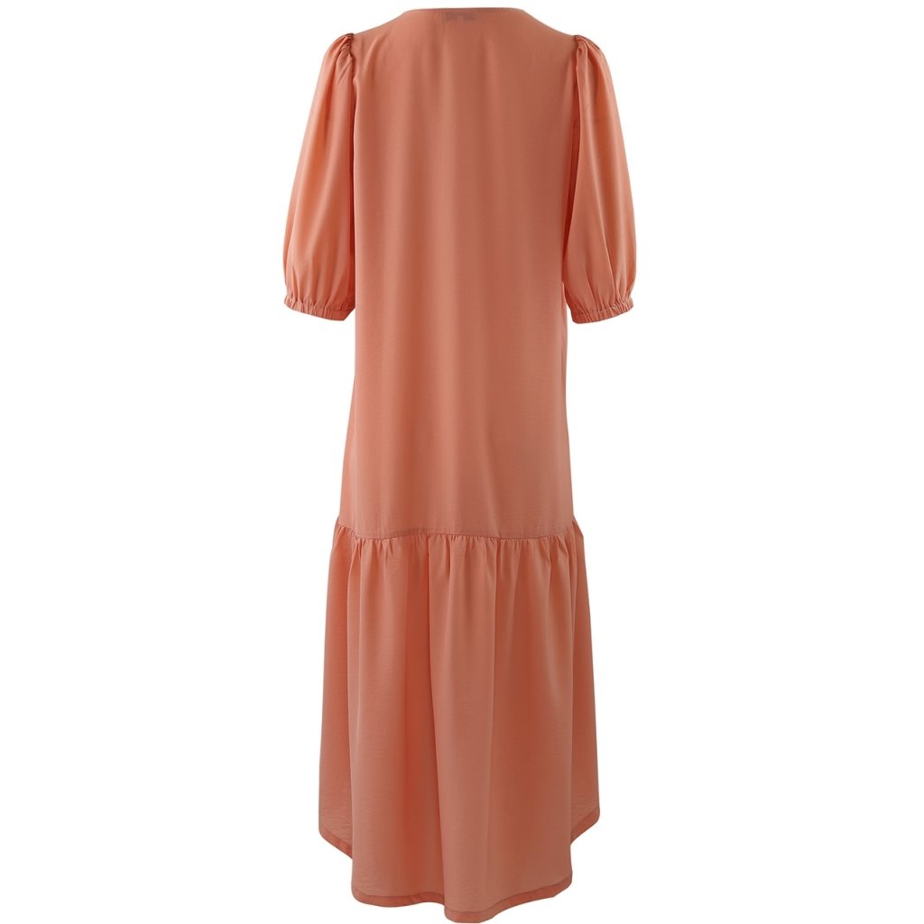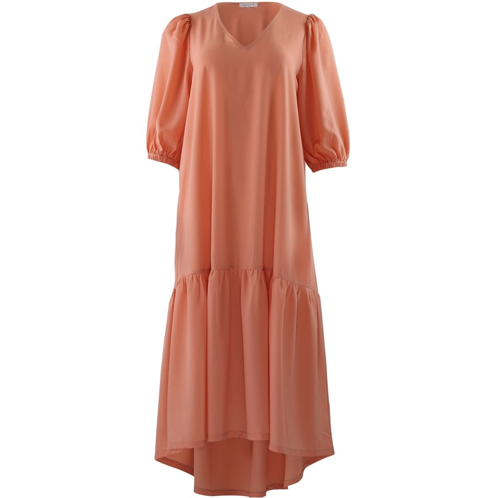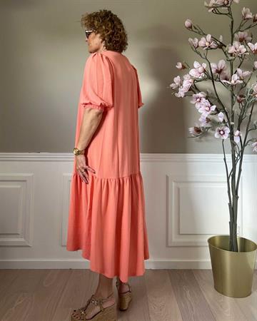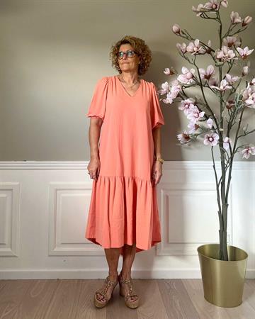 Lækker midi-kjole fra Continue i grøn med V-hals og korte 3/4 lange ballonærmer med elastik. Stoffet er lækkert elastisk - og bare skøn at have på.