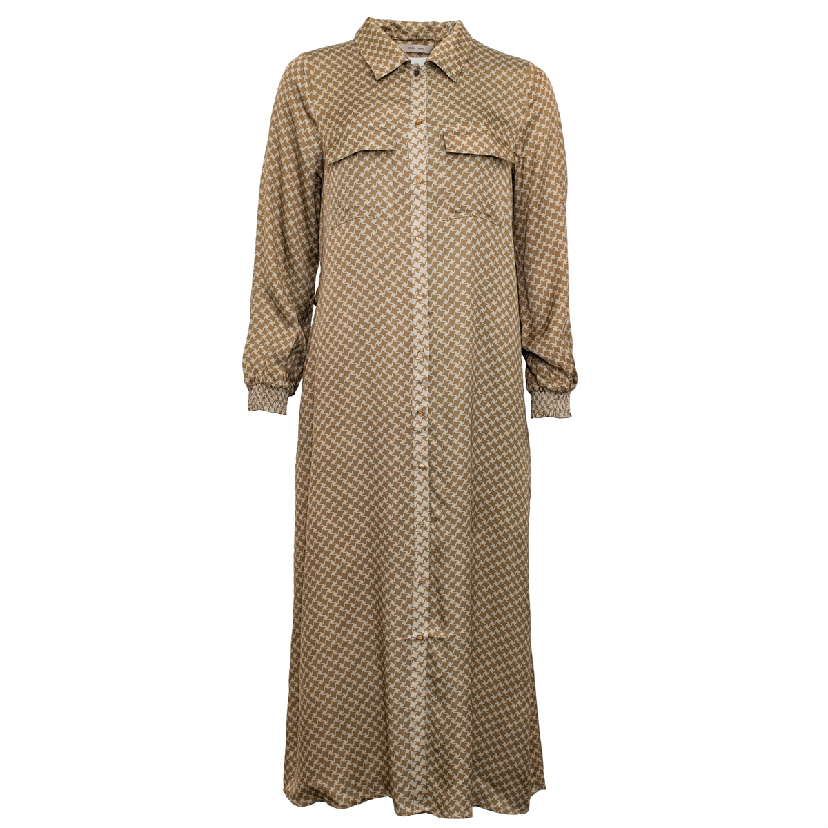 En virkelig MUK OG KLASSISK amt elegant kjole i 100% viscose fra Costamani. Kjolen er i mixet print hvilket fremhæver den fine stolpelukning og manchetter. Markere taljen med det bælte der høre til for et feminint look.