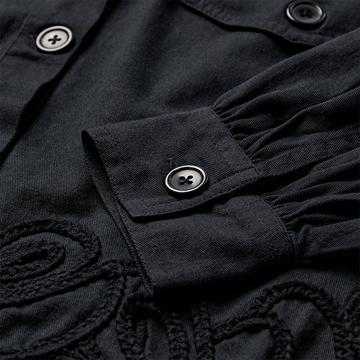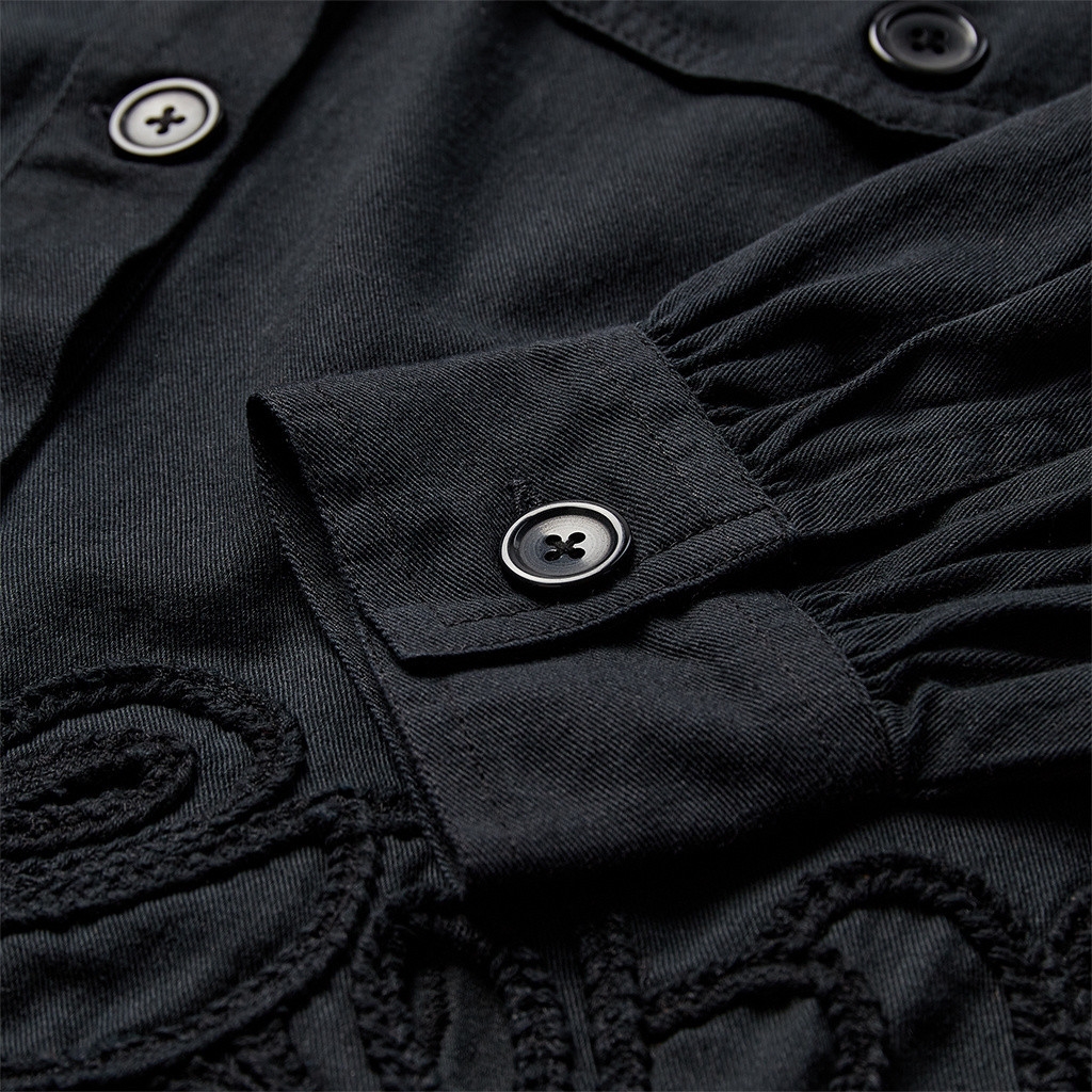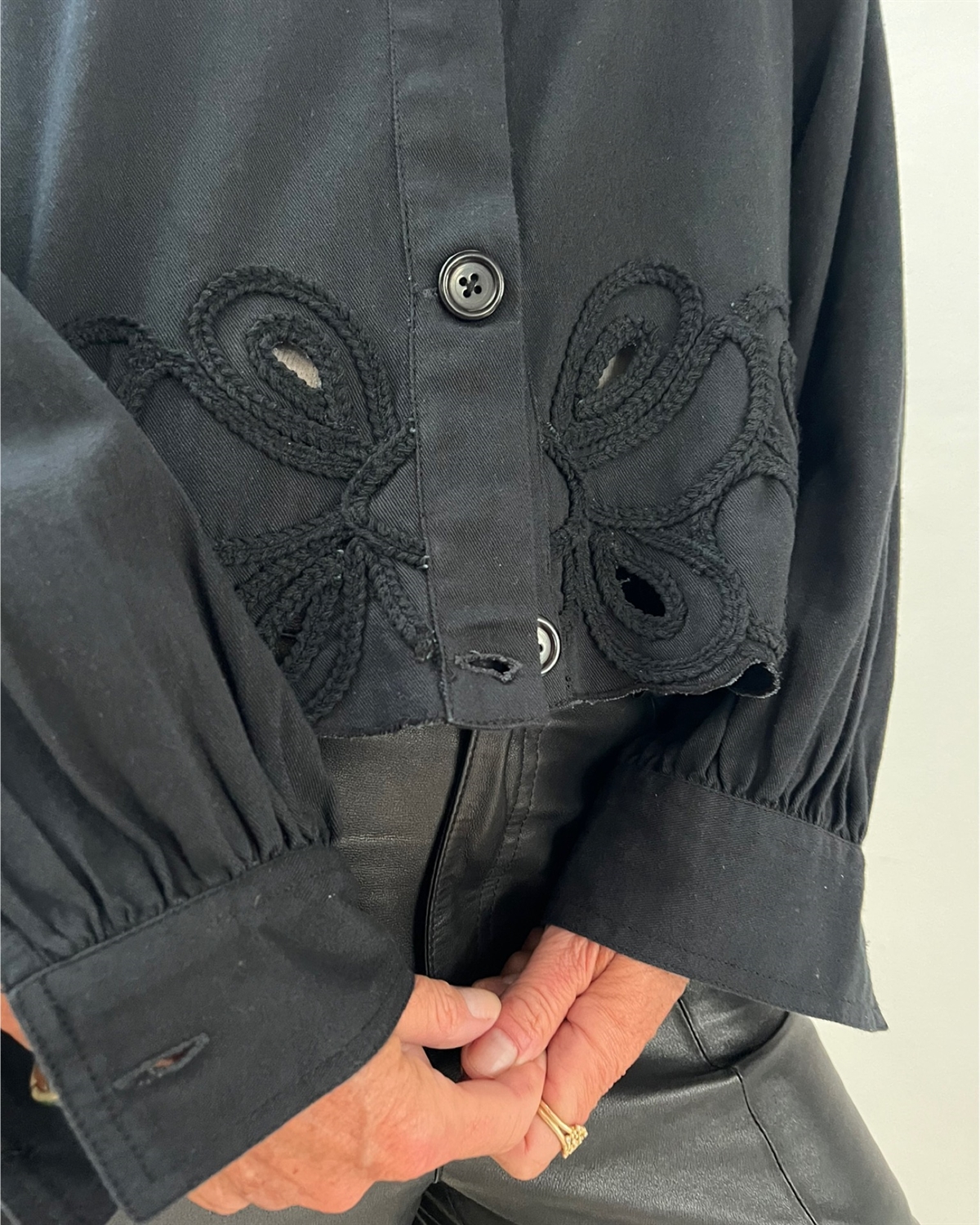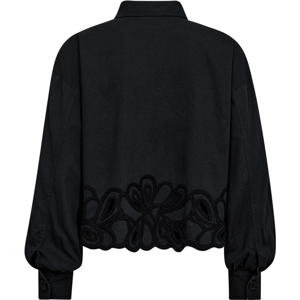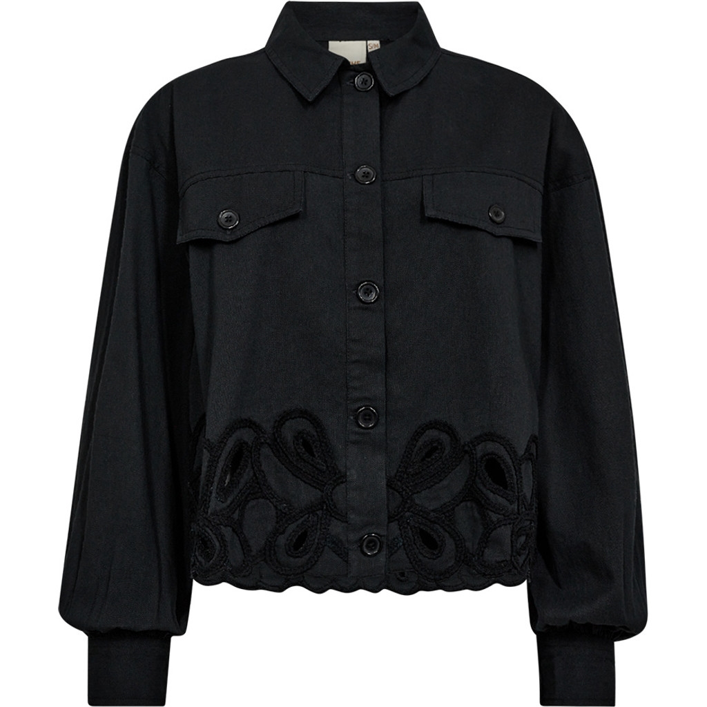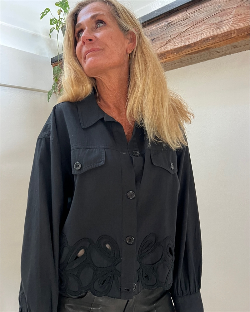 Unikke jakke fra Depeche Clothing! CassyDE Jacket er en cool og elegant jakke, der kombinerer rå attitude med feminine detaljer. De smukke broderede mønstre forneden tilføjer et eksklusivt touch, mens den klassiske skjortekrave og brystlommer giver jakken et moderne, afslappet look.
