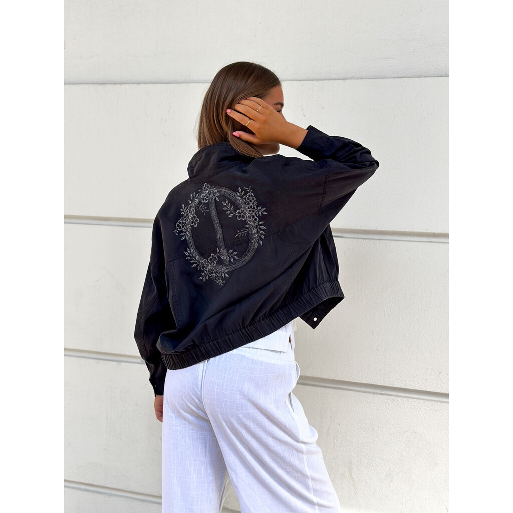 Depeche Nelia jakken er en enkel, men iøjnefaldende tilføjelse til enhver garderobe. Denne løstsiddende jakke har lange ærmer og er dekoreret med smukt broderi bagpå, hvilket giver den et unikt og elegant udtryk. Foran har jakken to praktiske lommer - den ene med lynlås og den anden med knaplukning, hvilket tilføjer både stil og funktionalitet.