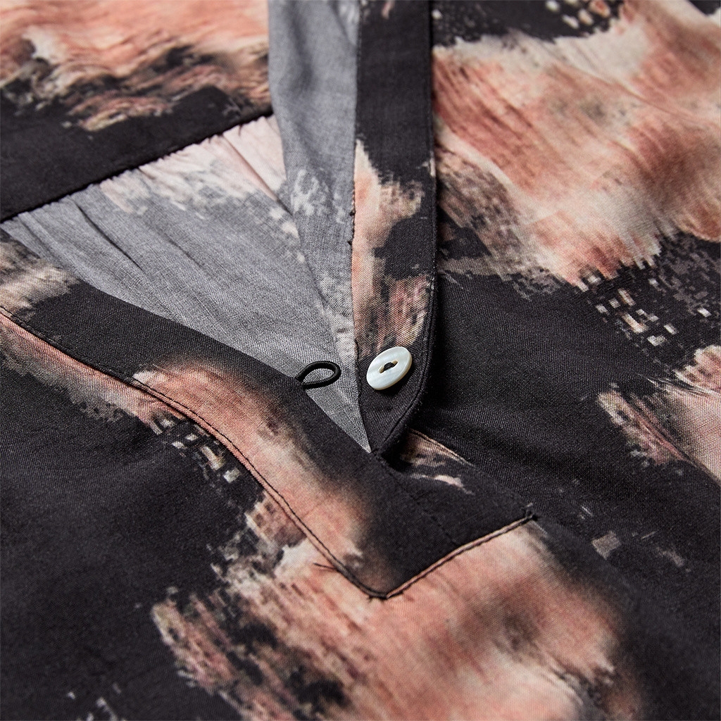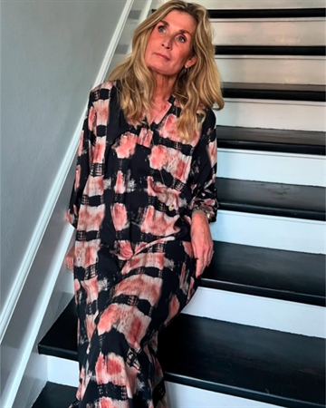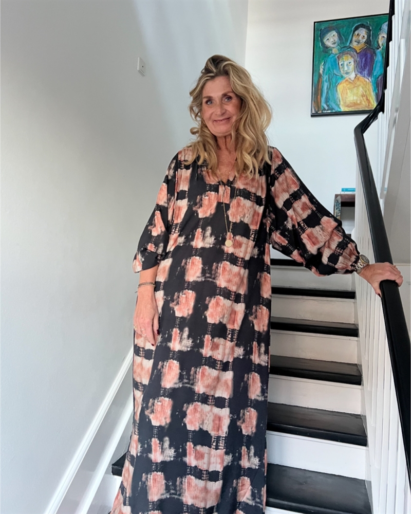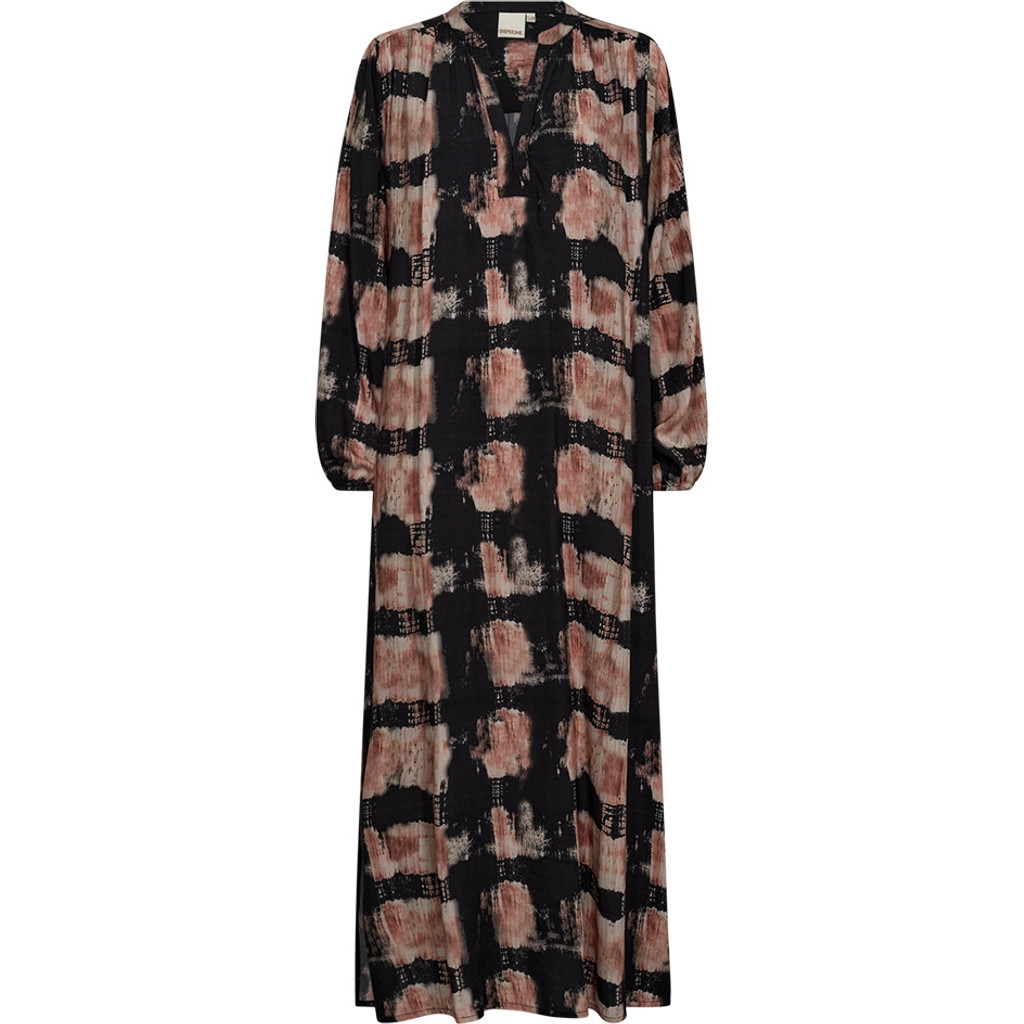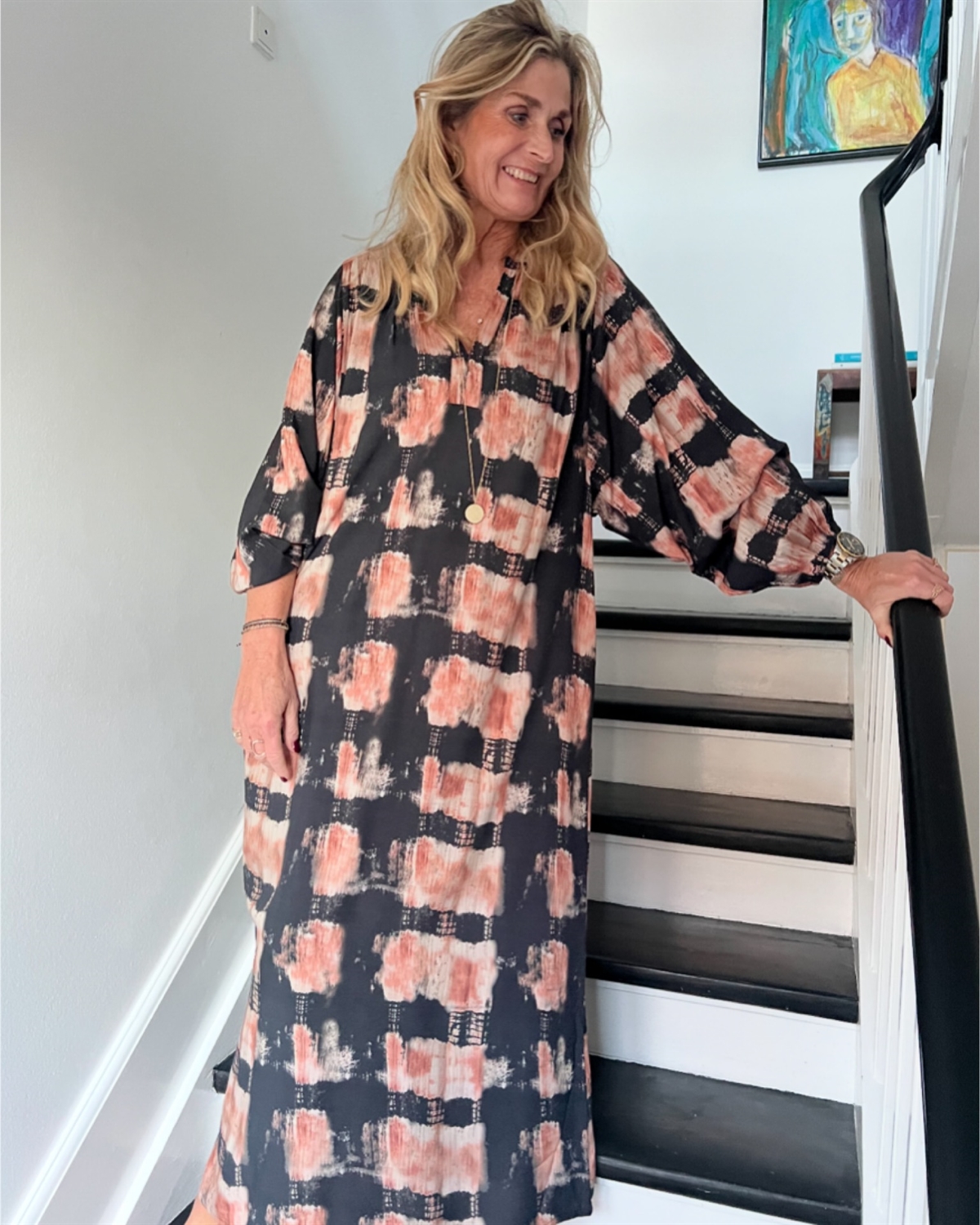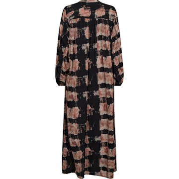 Denne smukke kjole kombinerer et unikt mønster i sort og rosa toner med et afslappet, men stilfuldt snit. Med sin luftige pasform, V-hals og lange ærmer med elastikkant skaber den et feminint og sofistikeret udtryk. Perfekt til både hverdagsbrug og særlige anledninger – style den med sneakers for et afslappet look eller hæle for et mere eksklusivt touch.