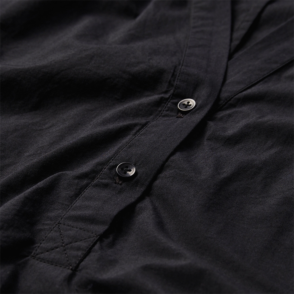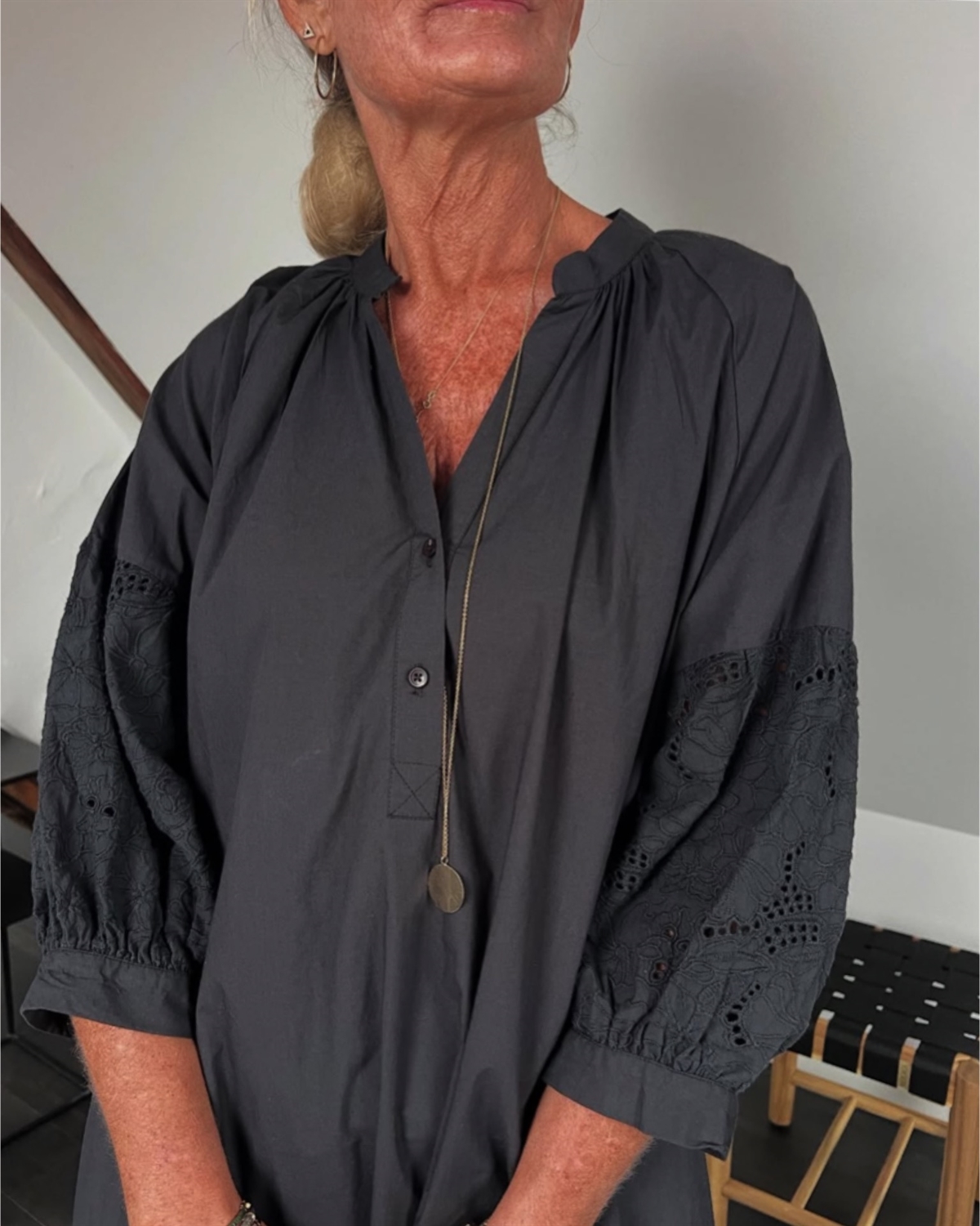 De dekorative broderier på de voluminøse ærmer tilfører en boheme-inspireret kant, mens den klassiske knaplukning ved halsudskæringen giver mulighed for et personligt touch – enten lukket for et elegant udtryk eller let åben for et mere afslappet look.