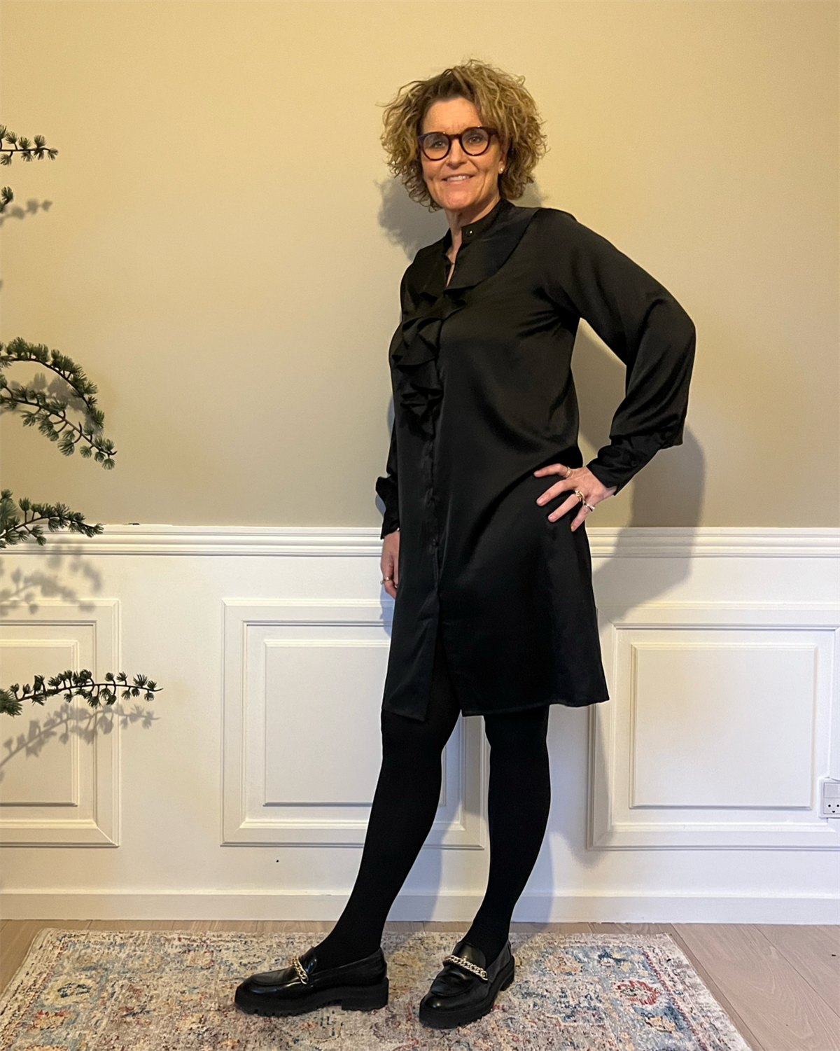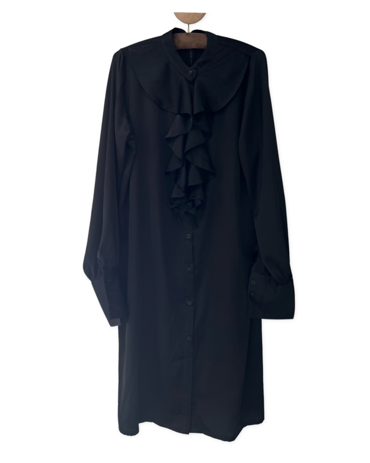 Smuk kjole med langt ærme og stolpelukning hele vejen ned. Kjolen har lang manget på ærme og flæse ned langs stolpelukningen. Perfekt til enhver festlig anledning - eller til kontoret.