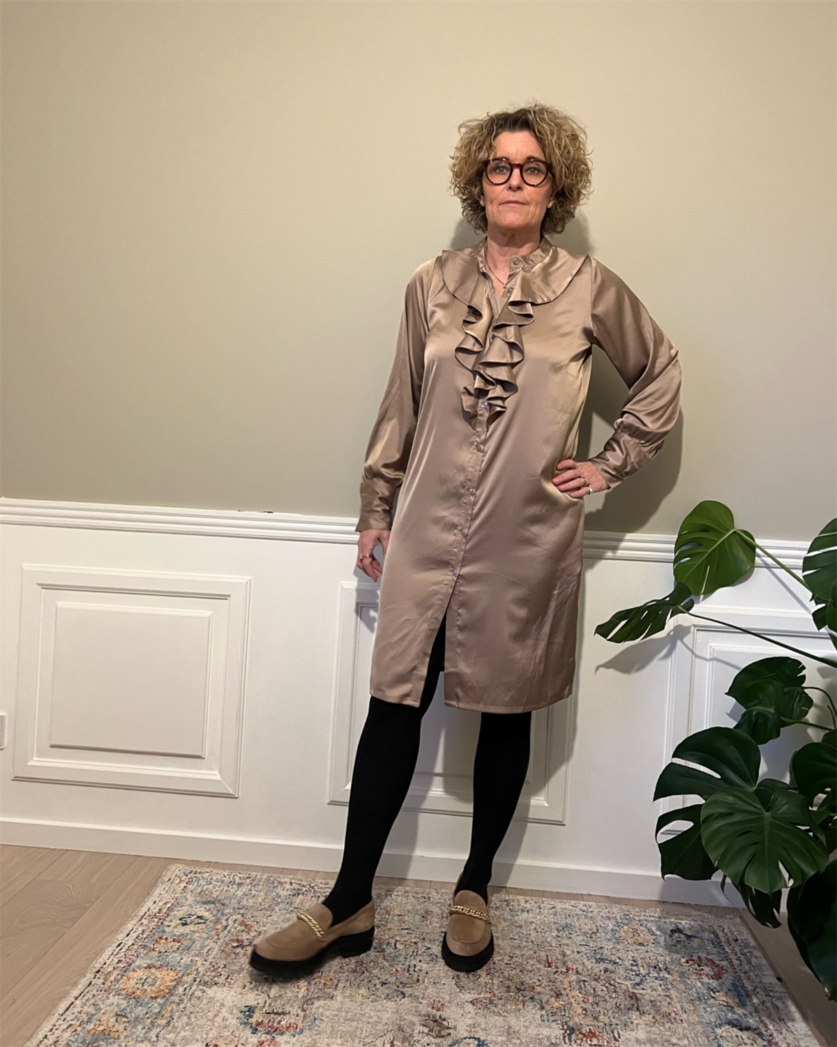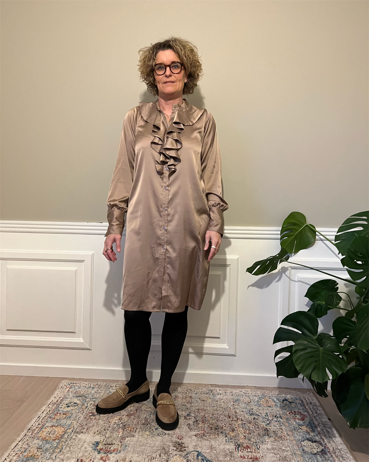 Smuk kjole med langt ærme og stolpelukning hele vejen ned. Kjolen har lang manget på ærme og flæse ned langs stolpelukningen. Perfekt til enhver festlig anledning - eller til kontoret.