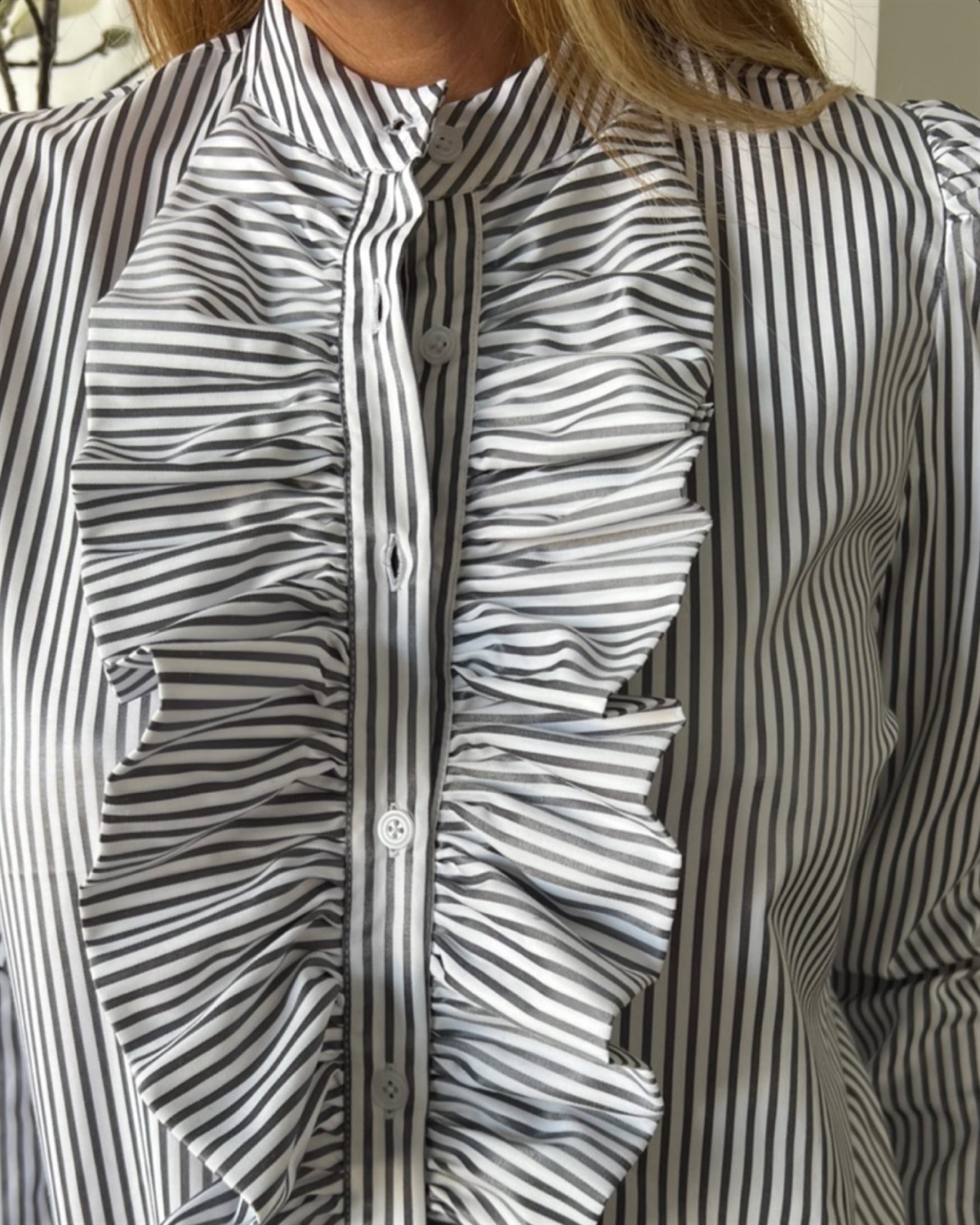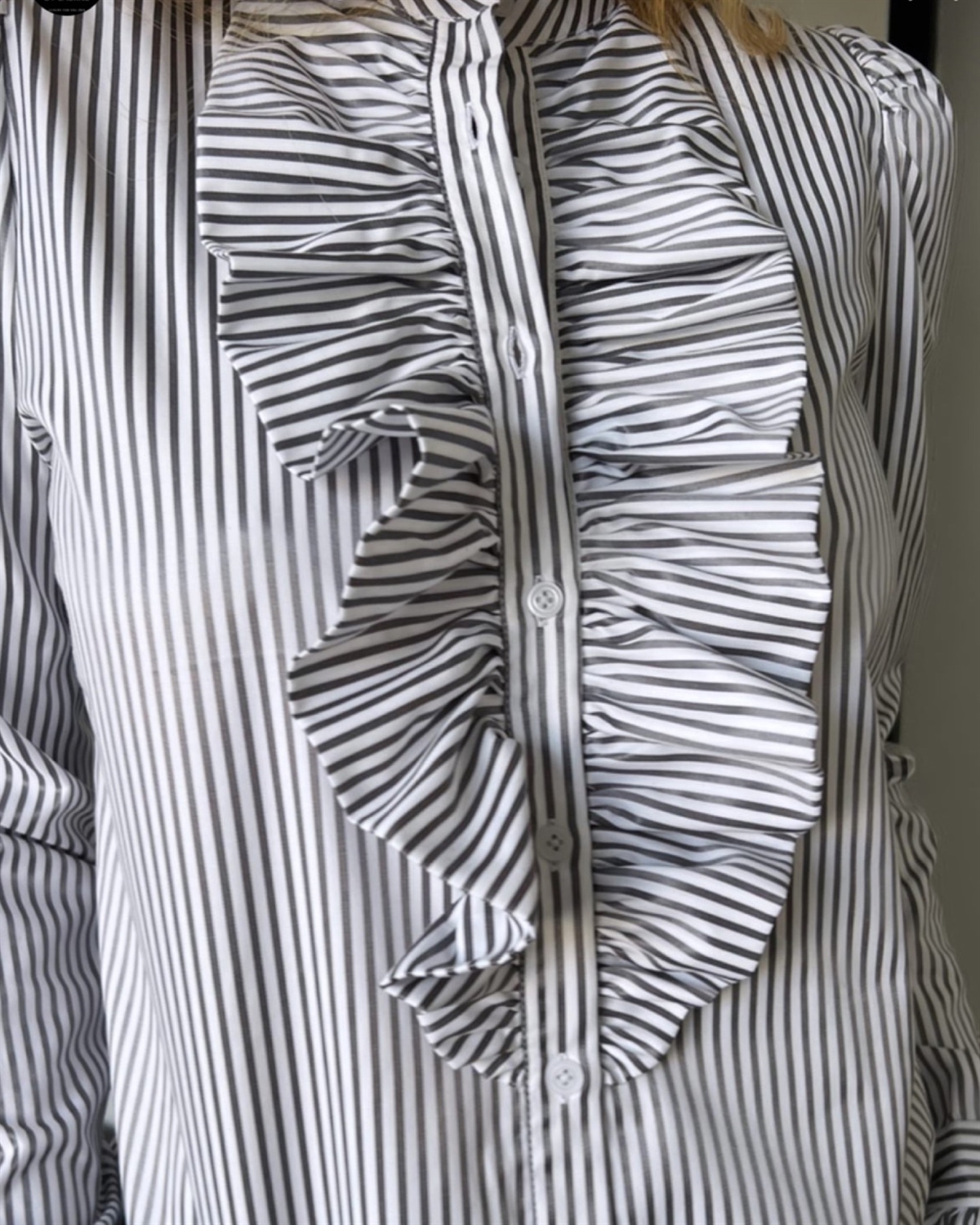 Produkt nummer: Anne Ruffle Skjorte - Hvid og shiney strib i Grå-sort