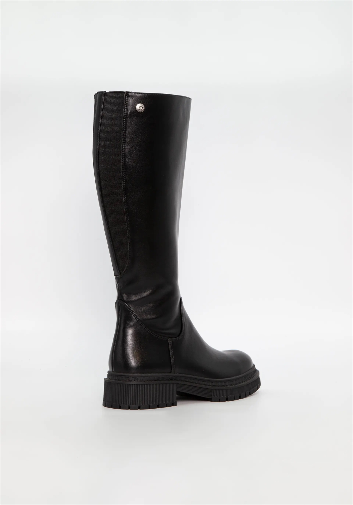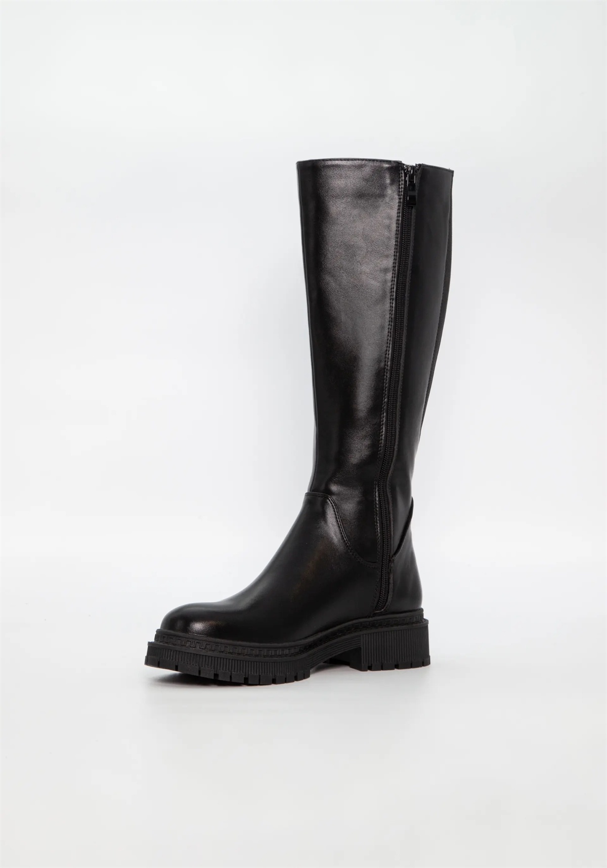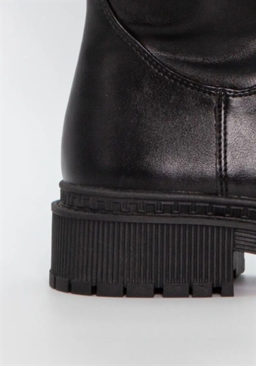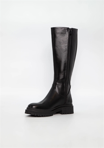 Høj støvle i imiteret skind med lynlås på indersiden for nem af- og påtagning. Støvlen har to elastikker bagpå, hvilket gør den passende til mange.
