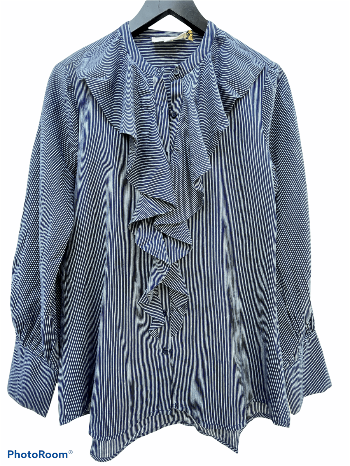 Skøn bluse med flæser i mørkeblå med tynd hvid strib fra Eva Go Diva. Skjorten lukkes med knapper langs fronten og lange manchetter med 4 knapper.