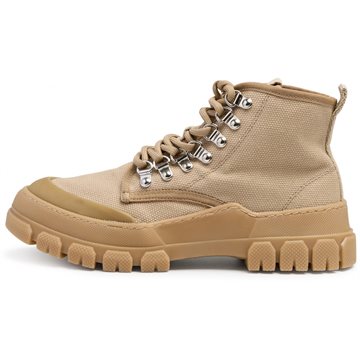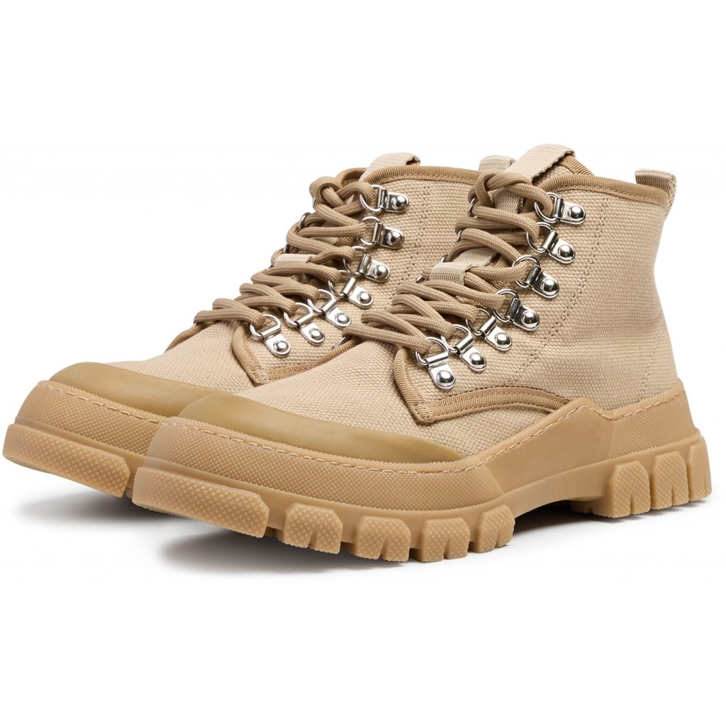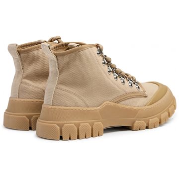 Sandfarvet / taupe canvasstøvler fra Garment Project som er lavet af 100% genbrugsplast, Støvlerne har gule og sorte snørebånd samt gummisnude og gummisål.