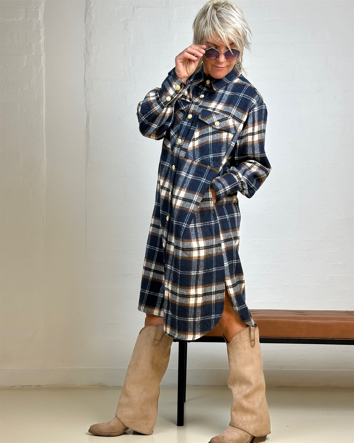 En lækker lang og lun oversized ternet skjorte, der kombinerer afslappet komfort med et moderne, feminint udtryk. Skjorten kan både bruges som skjorte og kjole, hvilket gør den til et alsidigt valg i garderoben.