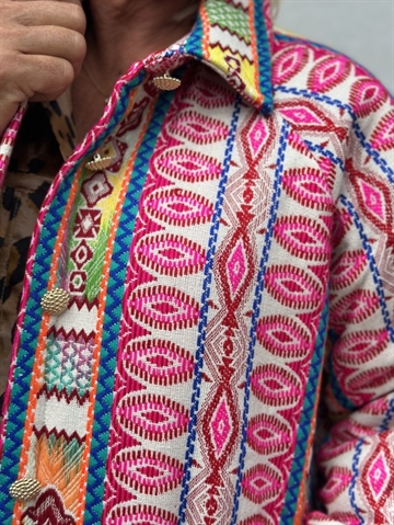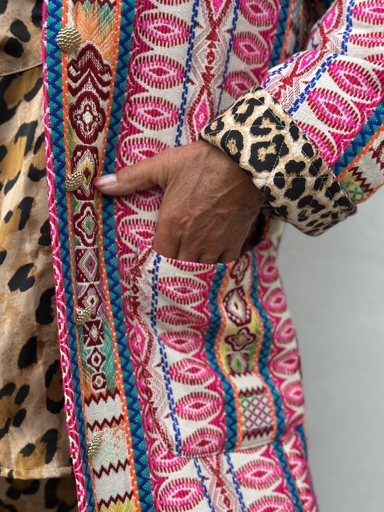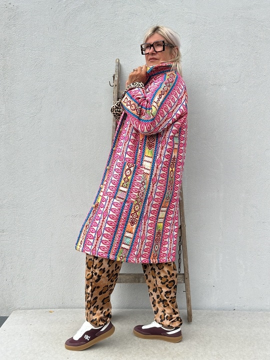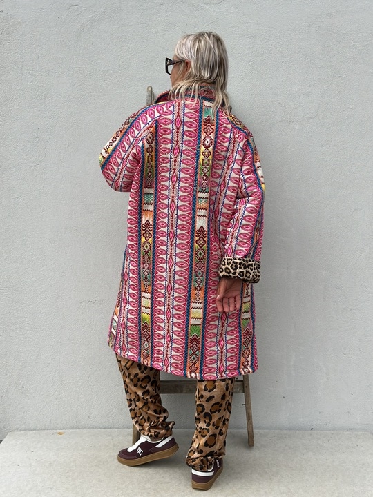 Giv din garderobe et kunstnerisk og farverigt løft med denne unikke frakke, der kombinerer klassisk pasform med moderne boheme-vibes. Frakken er fremstillet i et struktureret vævet tekstil med et levende og detaljerigt etnisk-inspireret mønster i jordnære toner.