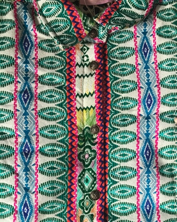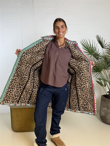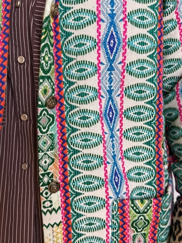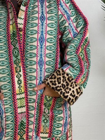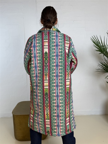Giv din garderobe et kunstnerisk og farverigt løft med denne unikke frakke, der kombinerer klassisk pasform med moderne boheme-vibes. Frakken er fremstillet i et struktureret vævet tekstil med et levende og detaljerigt etnisk-inspireret mønster i jordnære toner.