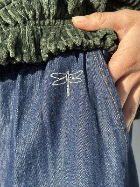 Lille guld logobroderi foran, under talje.