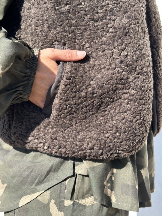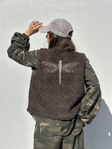 Kort teddyvest fra Gaspar med stort guld logo broderi på ryg.