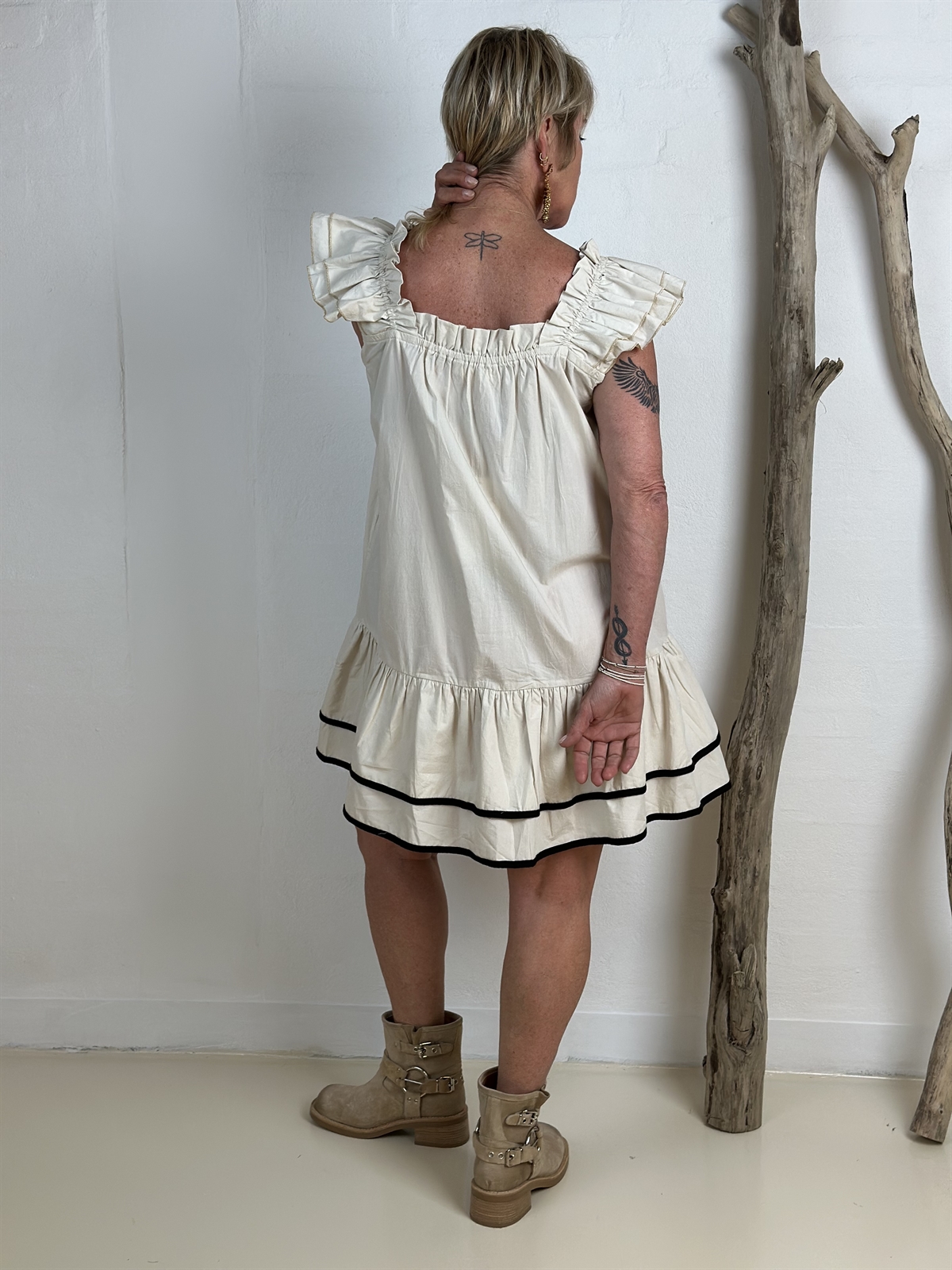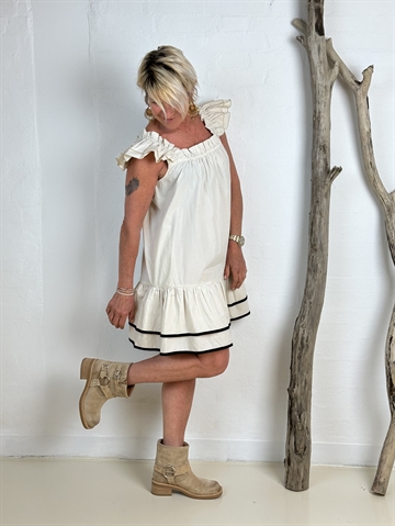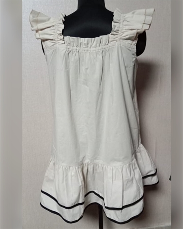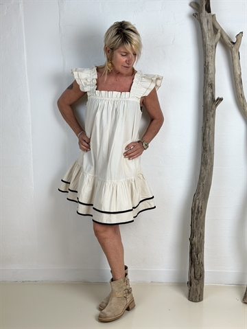 Kjolen kan styles både som en sød sommerkjole med bare ben og sandaler – eller som en tunika over bukser for et mere afslappet look. Kontrastbåndet ved flæsekanten tilføjer et eksklusivt twist, der gør kjolen til alt andet end almindelig.