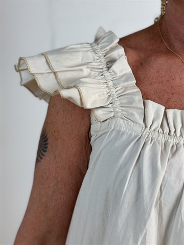 Gaspar Express Chloe Dress i Chalk er kjolen, der kombinerer komfort, legende detaljer og feminin charme i ét. Den smukke flæsekant forneden og på skulderstropperne giver kjolen et let og elegant udtryk, mens det løse snit gør den behagelig og luftig at have på.