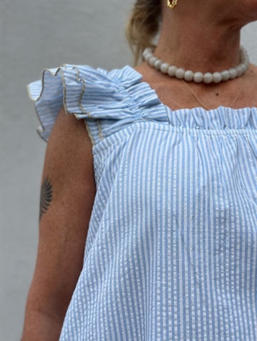 Gaspar Express Ciao Maxi Dress er den perfekte kombination af romantisk lethed og tidløs stil. Den lette silhuet, fine flæsedetaljer og de feminine striber giver kjolen et luftigt og eksklusivt udtryk – perfekt til varme dage og afslappede aftener.