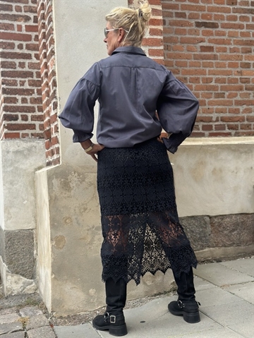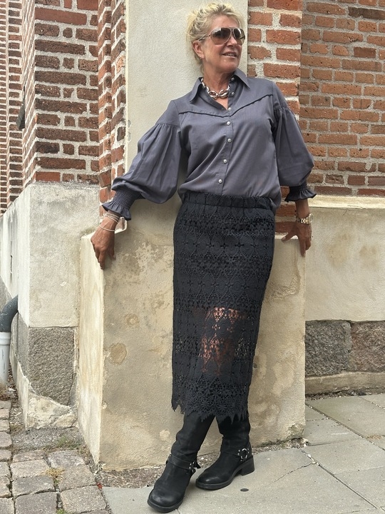 Yderstoffet er lavet af ren, blød blonde og afsluttes med en smuk tungekant i bunden. Foeret går til over knæet, mens selve nederdelen går til lige under knæet, hvilket skaber en flatterende silhuet. Modellen er fleksibel og kan nemt tilpasses forskellige lejligheder. Perfekt til både hverdagsbrug og festlige begivenheder.
