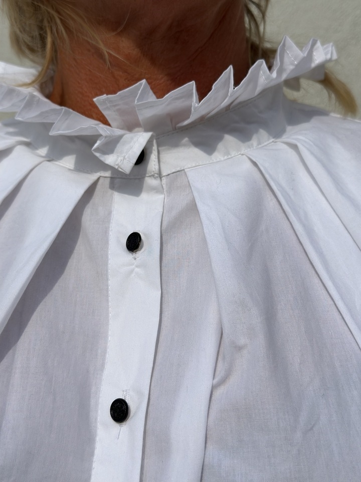 Meget feminin hvid skjorte med masser af detaljer.
