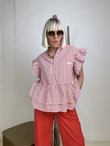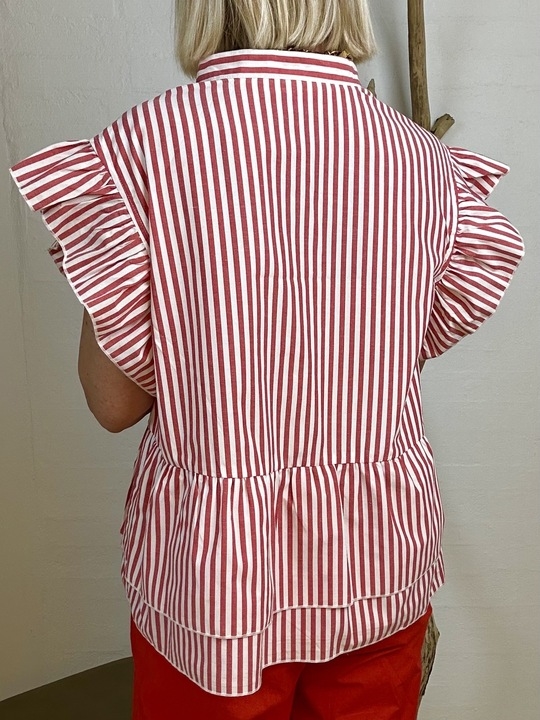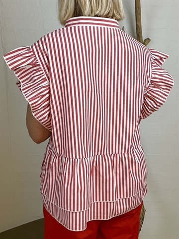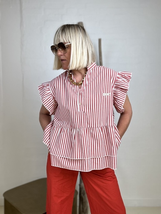 Rødstribet sommerfavorit med feminine detaljer. Gør dig klar til at tilføje et frisk pust til din garderobe med den smukke Jada Blouse fra GASPAR. Den rød- og hvidstribede bluse er et blikfang i sig selv med sine elegante flæseærmer, voluminøse skørt-effekt og fine knaplukning i halsen. En skøn blanding af klassisk stribet stil og moderne feminin charme.