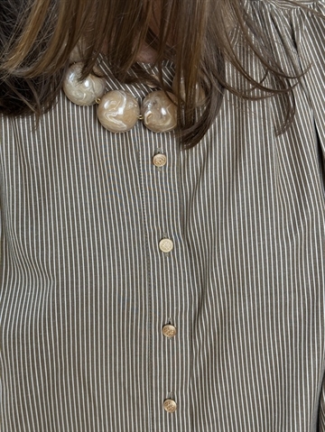 Modellen har stolpelukning foran med fine matte guldknapper og praktiske lommer i siden.