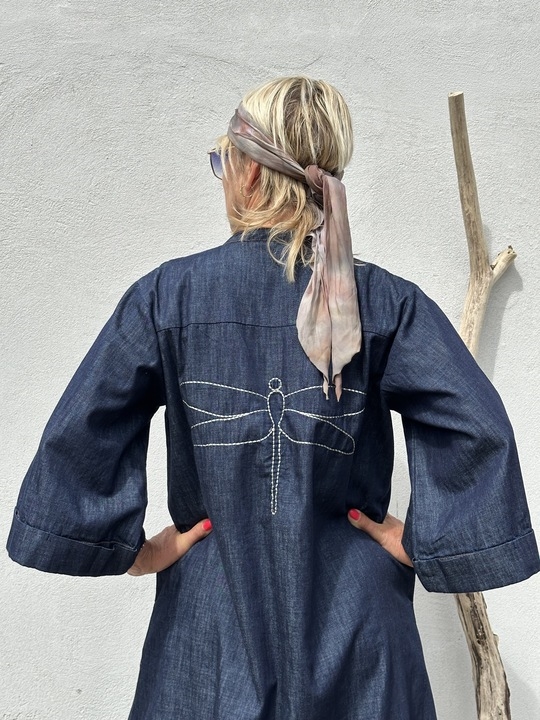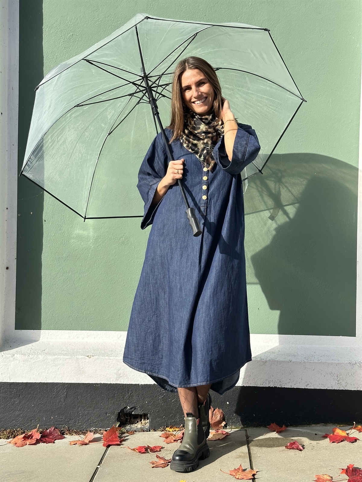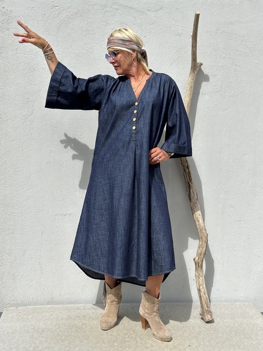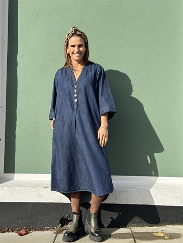 GASPAR Mumbai Denim Dress er en tidløs og cool kjole i en smuk mørk blå denim, der kombinerer komfort og stil i ét design. Kjolen har en flatterende V-udskæring og lukkes foran med matte guldknapper, der tilfører et diskret eksklusivt udtryk. Ærmerne har 3/4 længde med god vidde og afsluttes med et fint opsmøg, som giver kjolen et afslappet, men gennemført look.