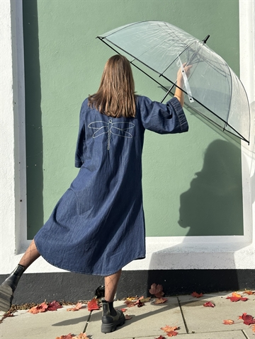 Pasformen er løs og behagelig med praktiske sidelommer, og kjolen er designet med en let høj-lav længde – lidt kortere foran end bagpå – hvilket skaber en flot silhuet i bevægelse. På ryggen finder du et stort broderet guldfarvet logo i form af en smuk guldsmed, der sætter prikken over i’et.