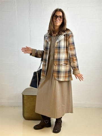 Blazeren har store guldknapper foran og sandfarvet bomuldsfoer.