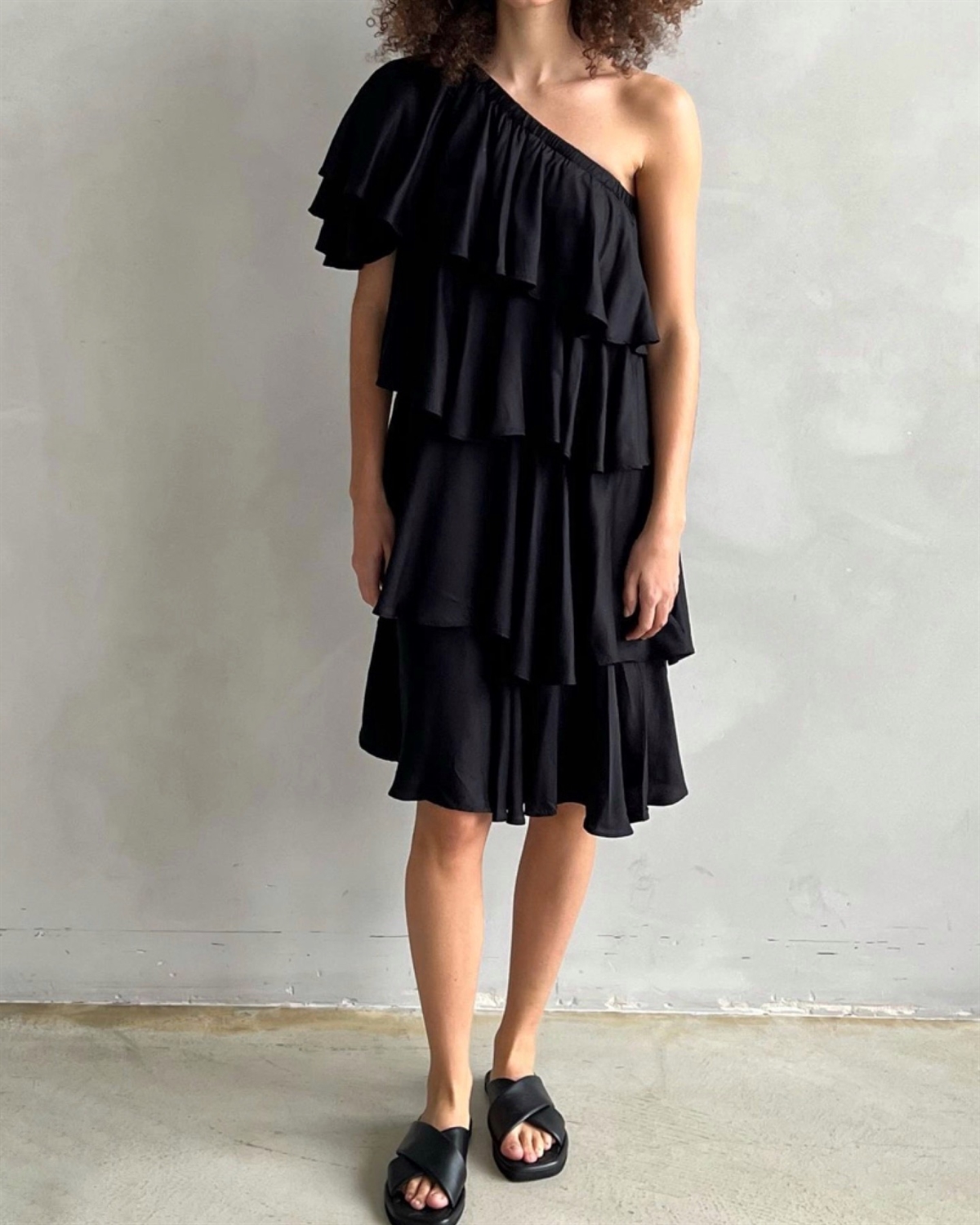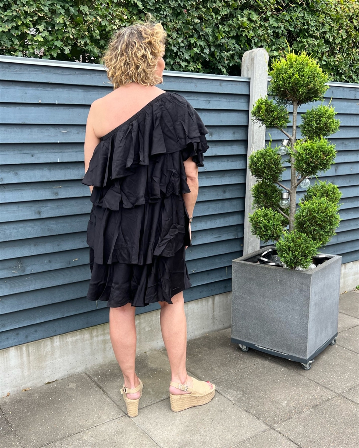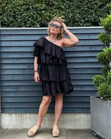 Den skønneste kjole fra GOSSIA i blød og lækker modal kvalitet. Juni kjolen kan både bruges som one shoulder og off shoulder, og har elastik i halskanten og er asymmetrisk i bund og ærme. Kjolen har masse af vidde i krop og ærme.